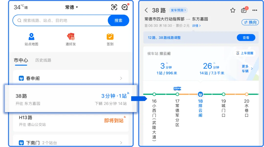 除此之外,运营情况变动的线路,其详情页也会展示变动情况,搭乘该线路的乘客可以及时获取线路变动情况。