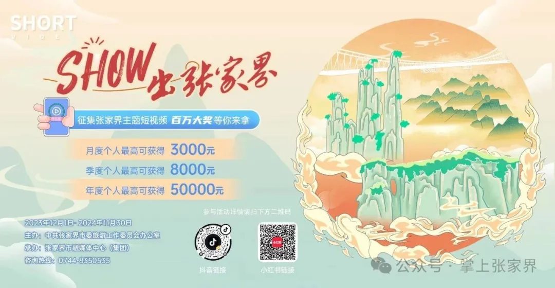 吸引广大游客来张家界找寻属于自己的快乐,并在社交平台上展示自己镜头下捕捉的张家界美景,分享在张家界的体验、感受和收获。游客通过积极参与“Show出张家界”短视频大赛,更有机会赢取丰厚奖励。