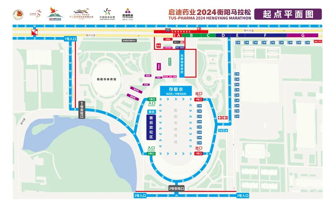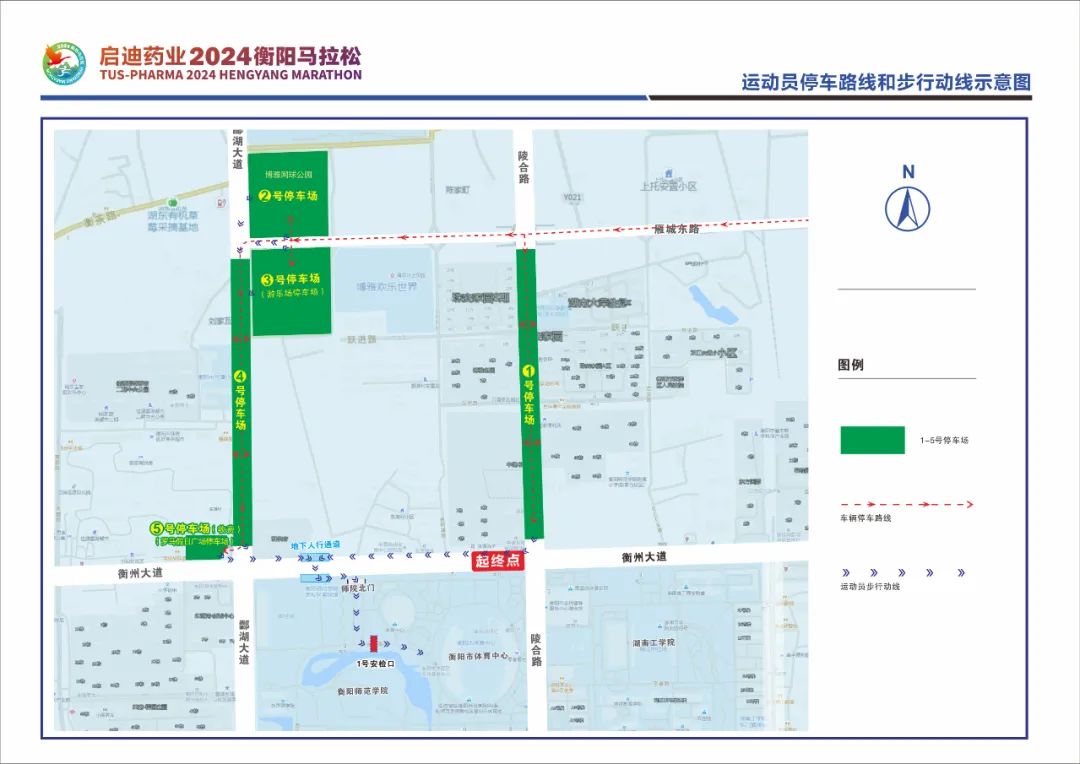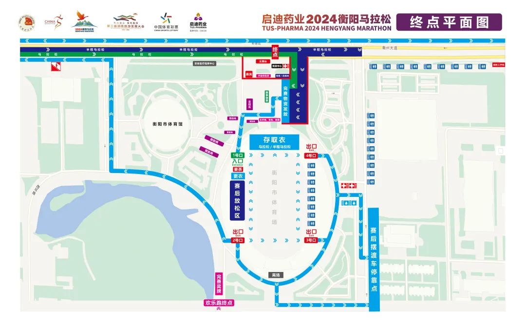 启迪药业2024衡阳马拉松起、终点平面图(图片可点击放大查看,所有乘坐摆渡车的跑者均在赛后摆渡车停靠位置登车)