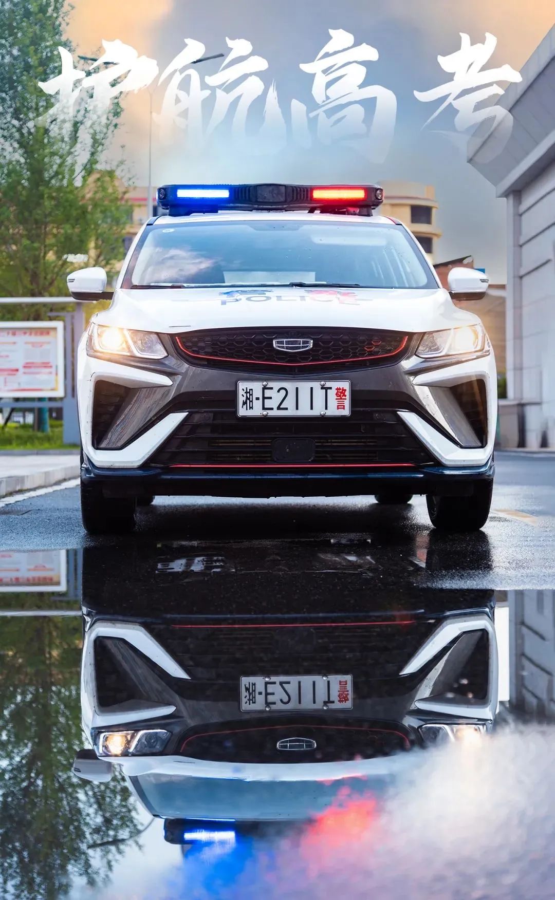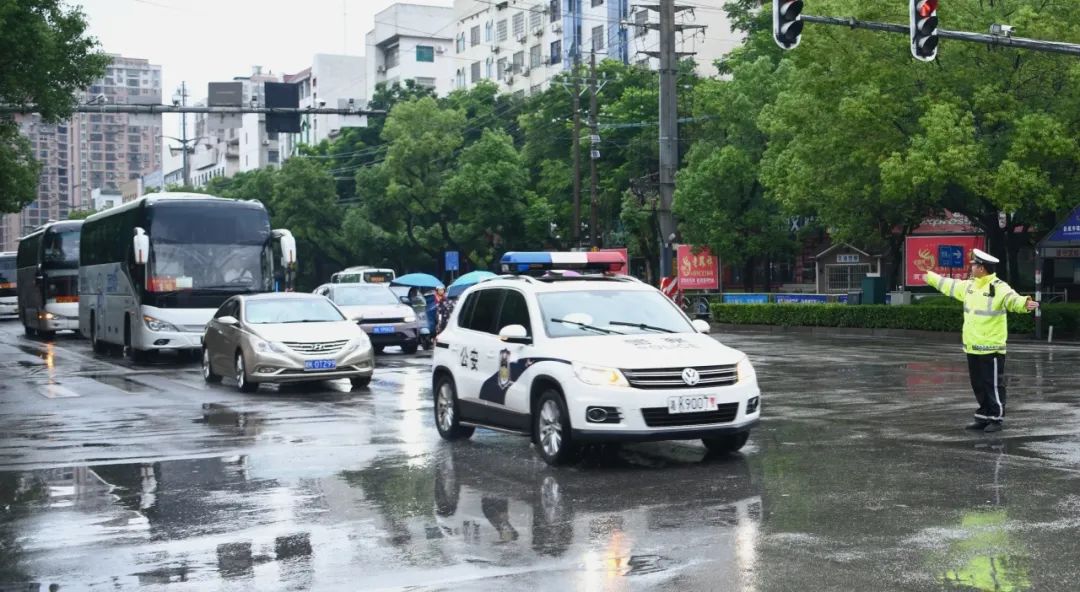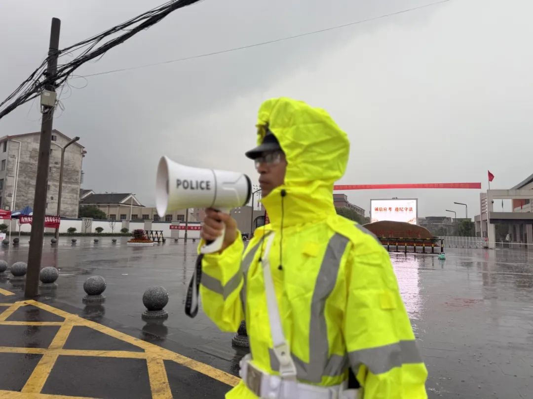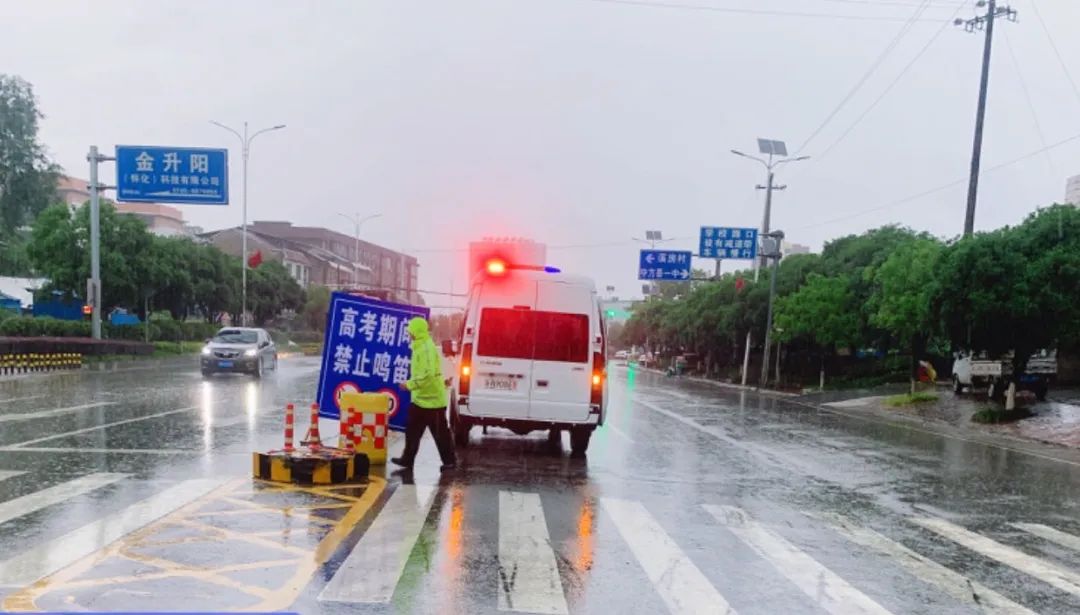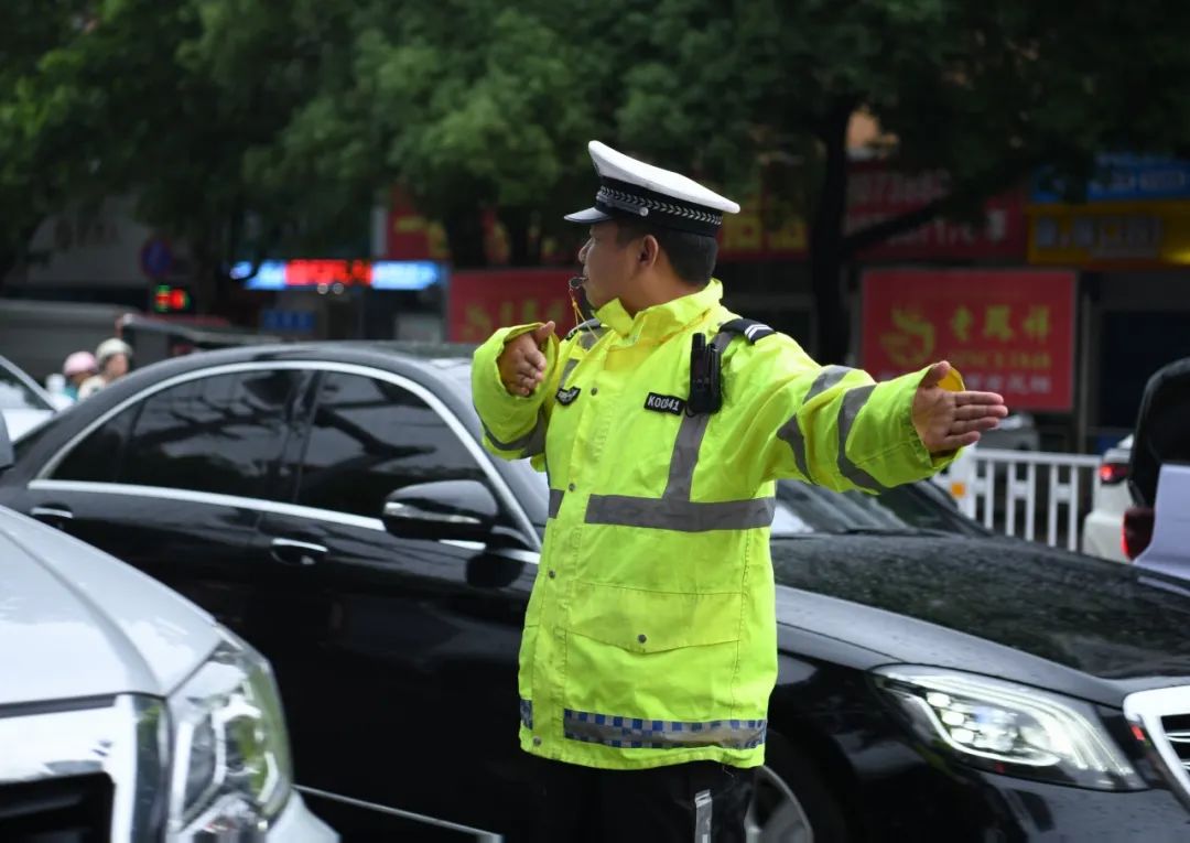 面对突如其来的暴雨,湖南交警全员在岗,与各部门通力协作,在风雨中为考生筑起一条条 “平安赶考路”。