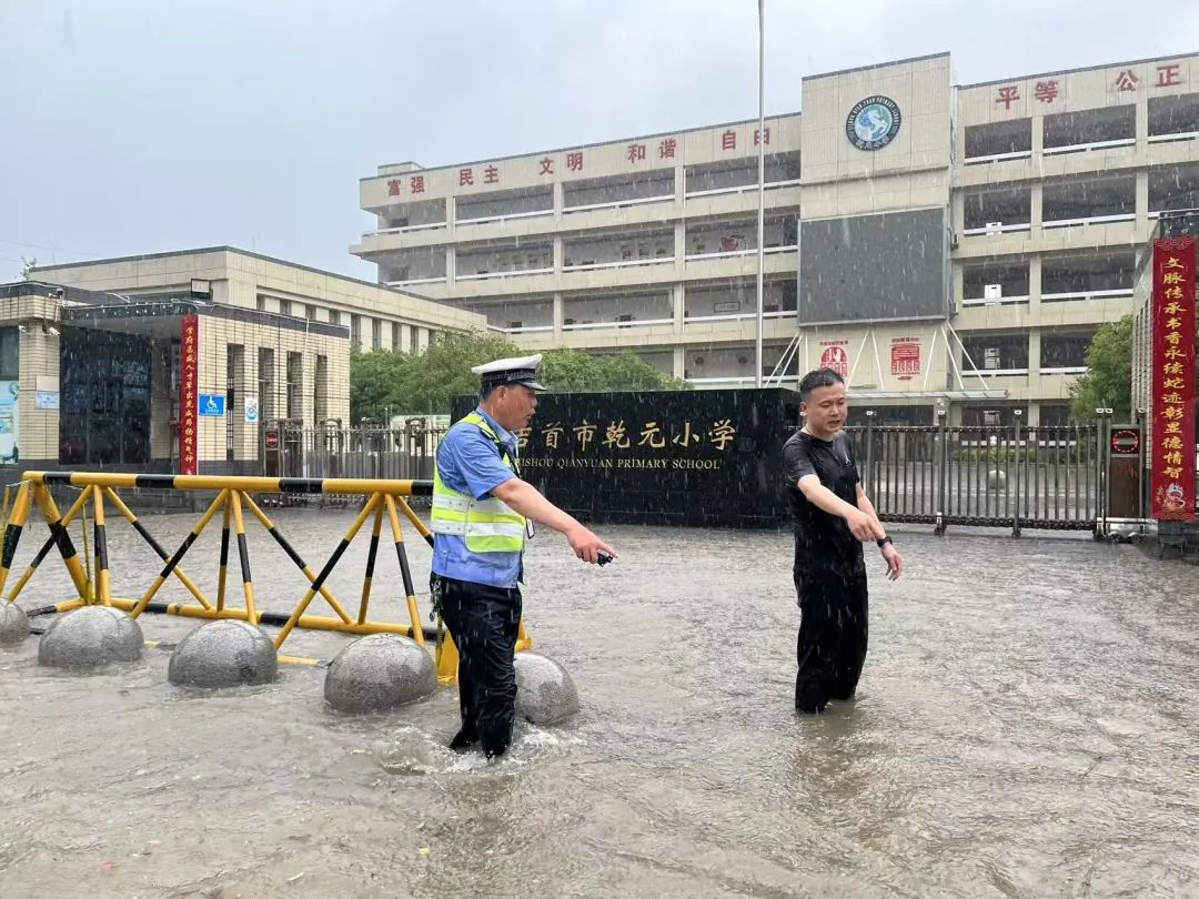 6月7日下午,湘西吉首突降暴雨,湘西交警在雨中清理路段排查安全隐患,指挥交通,守护考生、市民回家。