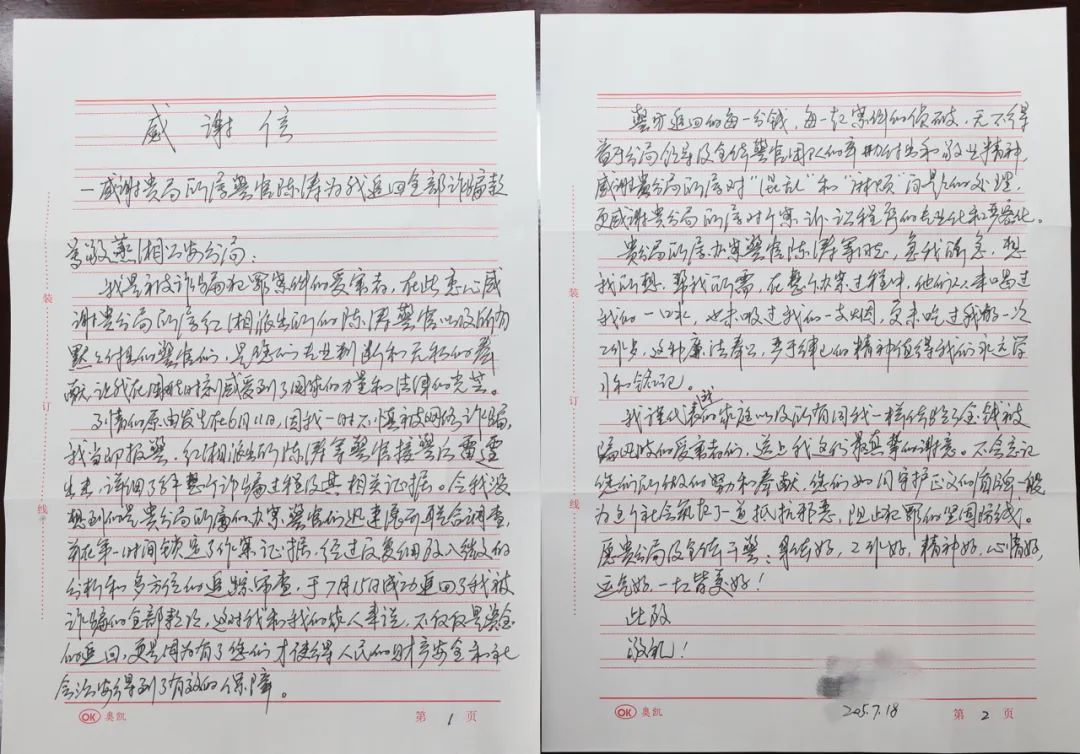 感谢民警为其全额追回被骗资金45万元