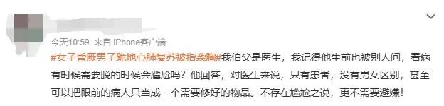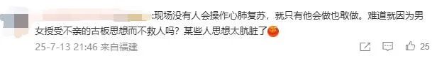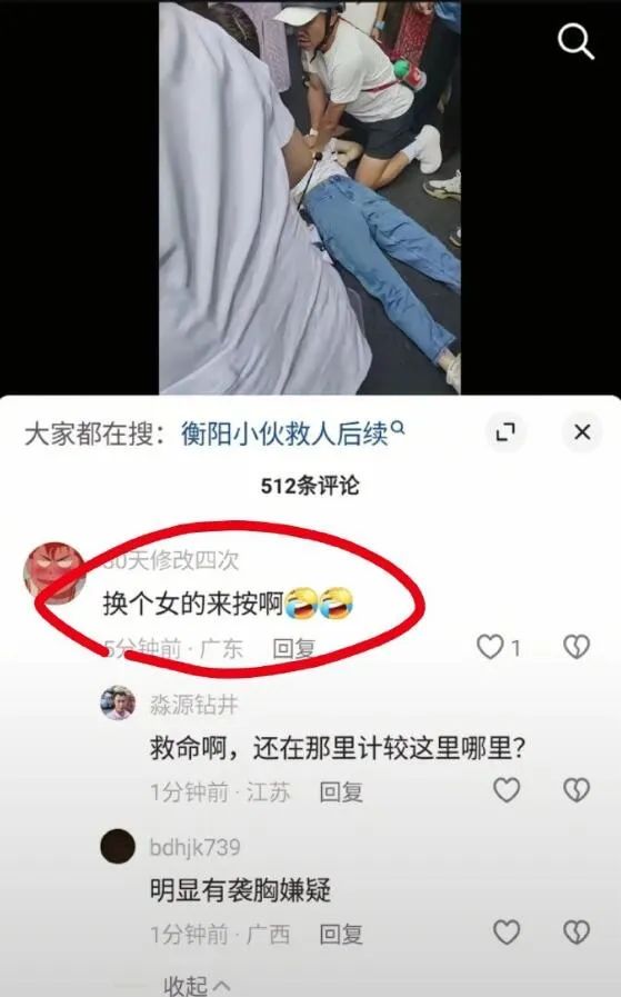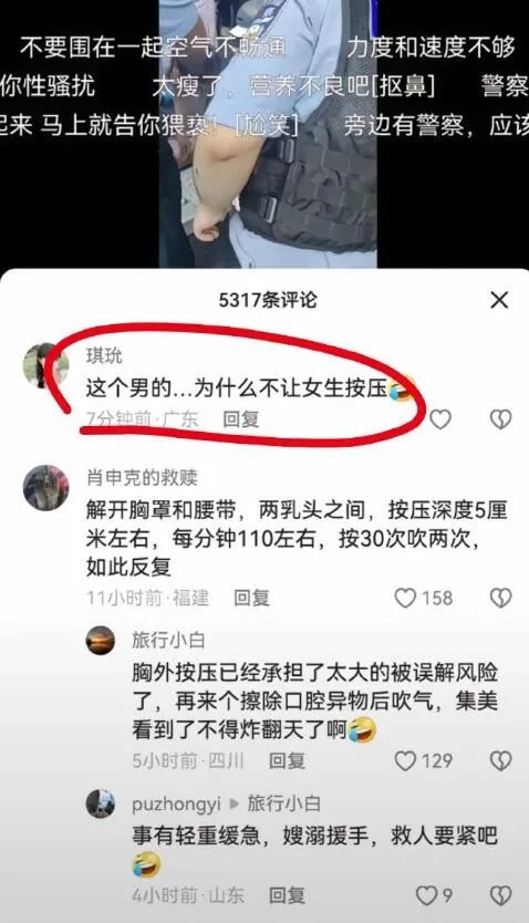 也就是其中一个画面——他双手压在女子胸部中间——被部分网友“放大”,说他“是不是袭胸”,甚至还有人留言:“为什么不换女的来按?”