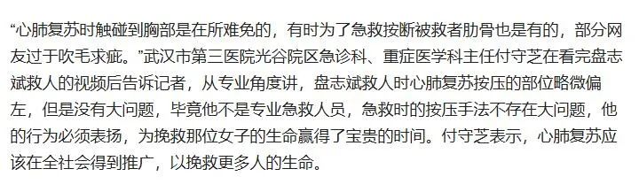 她说:“心肺复苏按的是胸骨中下段,是两乳头连线之间的中点,压重了甚至可能压断肋骨。盘志斌救人的手法没问题,行为值得赞赏。”