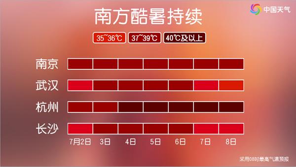 城市中,郑州、合肥、武汉、南京、上海、杭州、长沙、南昌、福州2日至8日将是高温不断,杭州4日至8日最高气温将维持在40℃或以上,如果预报实现,那在杭州7月观测史上是非常少见的。