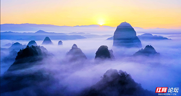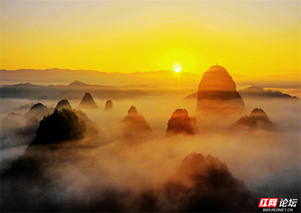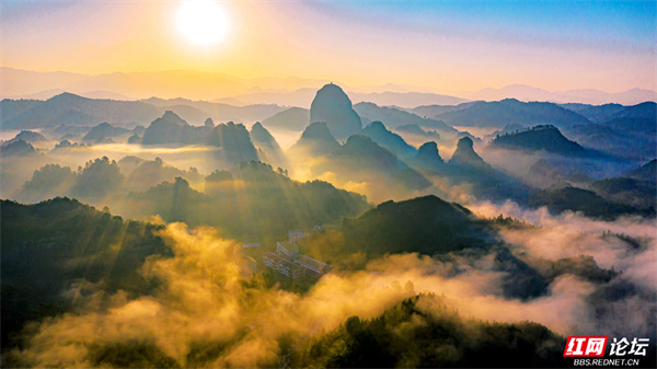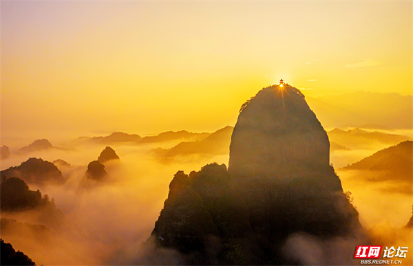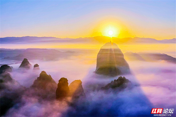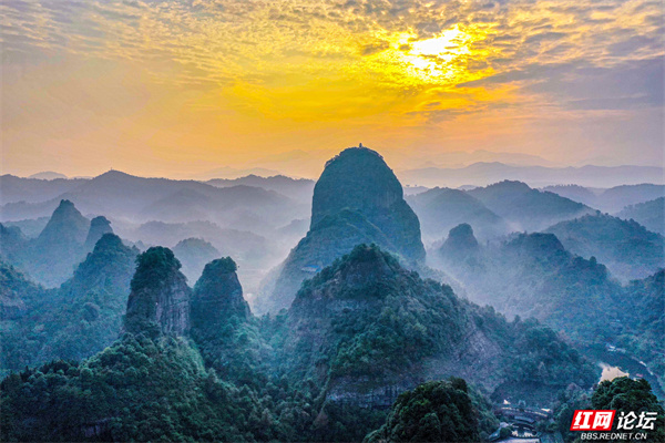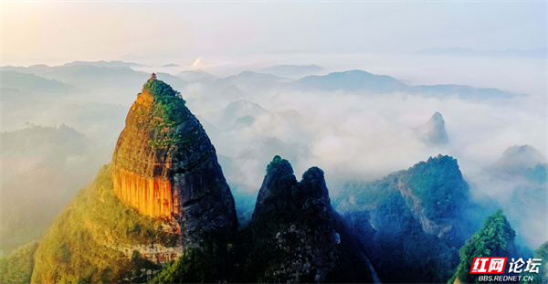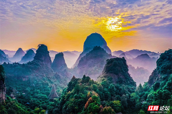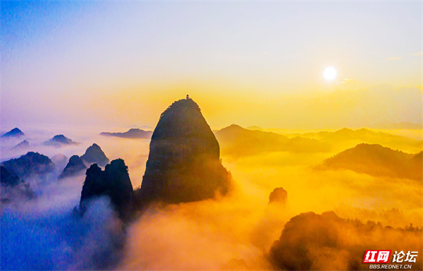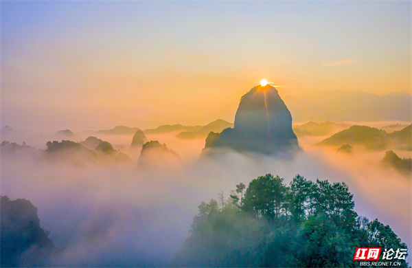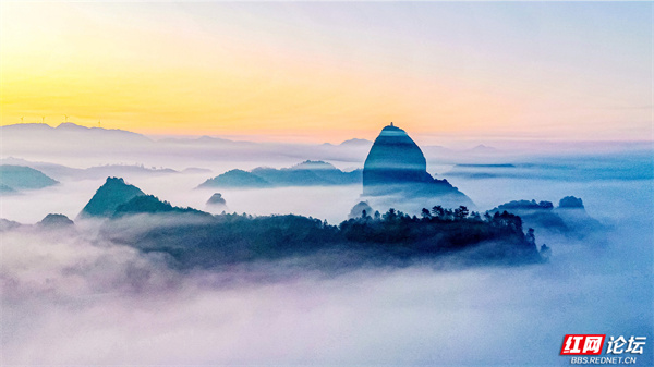 这片令人心驰神往的奇景,便是独岩民俗风情园的所在。它坐落在湖南省怀化市通道县城南郊,占地2.5平方公里,是一座玲珑秀美又气势恢宏的天然画卷。作为园内的最高峰,独岩峰傲然屹立,直径约百米,峰顶海拔602米。在云雾霞光之中,它宛如翘首向天的巨人,高耸入云,尽显其陡峭巍峨、鬼斧神工的自然伟力。数十座丹霞石峰环绕四周,或在晨曦中峥嵘毕露,或于流云间时隐时现,共同构成了这片丹霞地貌的壮美乐章。(图文/禹波 梦月文 王启友)