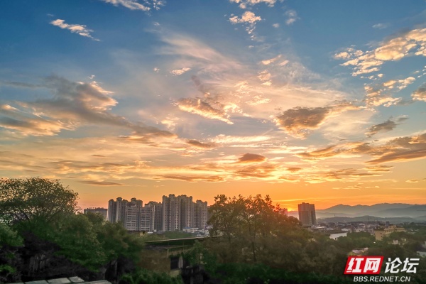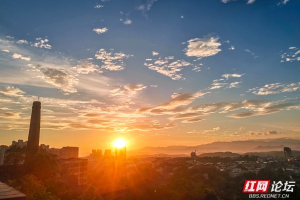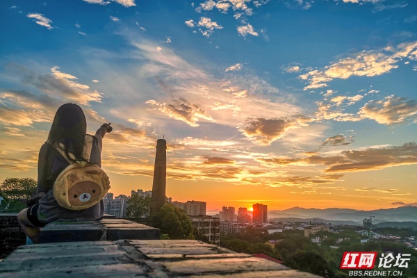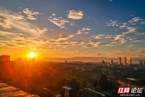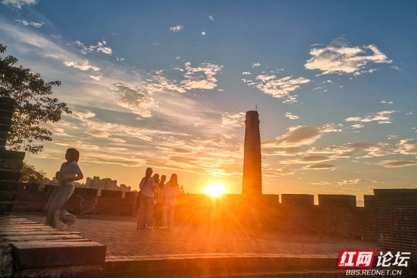 终于,熔金的核心,一枚浑圆炽烈的红球,挣脱所有羁绊,跃然而出!万道金矢迸射,瞬间将层峦、古木、山顶的青砖城墙尽数镀亮。那城墙的雉堞轮廓,在强光中骤然分明,砖缝间新生的苔痕与宿夜的露珠,在风停的刹那,折射出千万个微缩的太阳,青砖的棱角,此刻盛满了古老的晨光。我屏息,手背落了一滴微凉的露,转瞬被阳光晒暖,留下一点酥痒。山风骤歇,山脚下零陵古城的轮廓在金光中渐渐清晰,晨雾凝止。