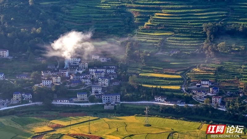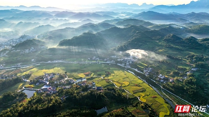 清晨,阳光轻洒,薄雾缭绕,炊烟袅袅,为村庄增添了灵动与梦幻的色彩。宁静的山村与自然山水浑然一体,展现出和谐之美;碧绿的猛洞河水轻抚岸边,稻浪起伏,仿佛低声吟唱着田园的诗意;阳光穿透轻雾,洒向大地,斑斓的色彩描绘出山水如画的意境。