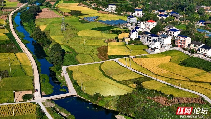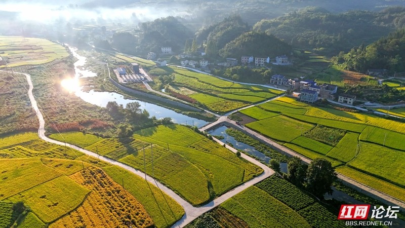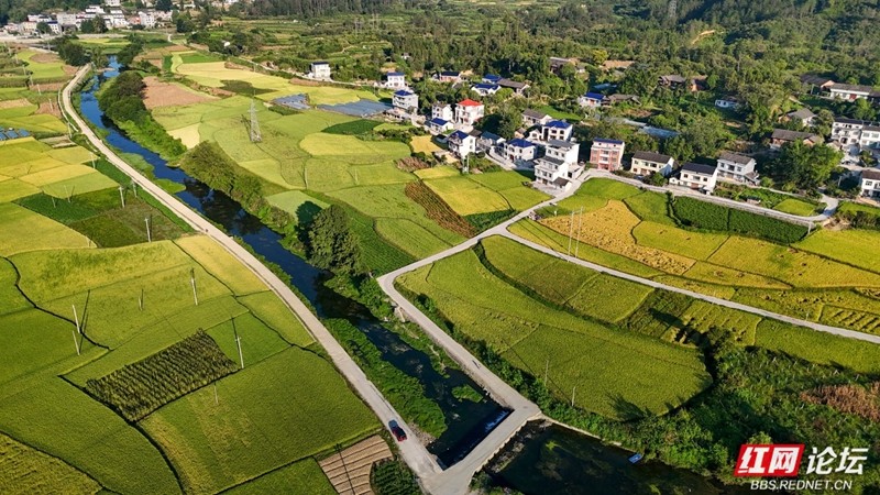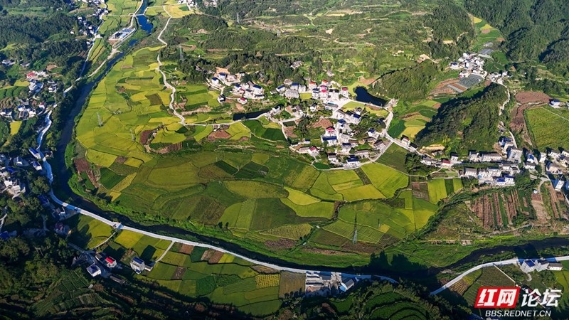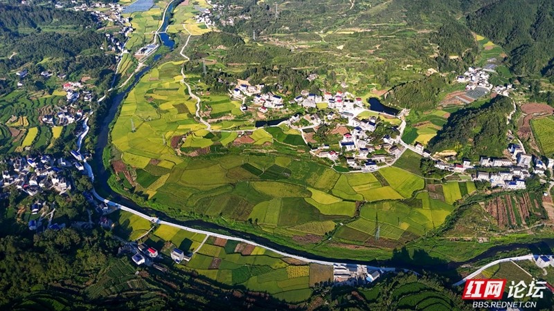金秋时节,沿猛洞河自石堤镇向西湖方向下行十公里,沿途山峦起伏、村庄错落、河流蜿蜒、田园如画。青山叠翠、碧水潺潺、白墙黛瓦、金色稻浪交织成一幅浓墨重彩的乡村画卷,被誉为“溪州大地的十里画廊”。