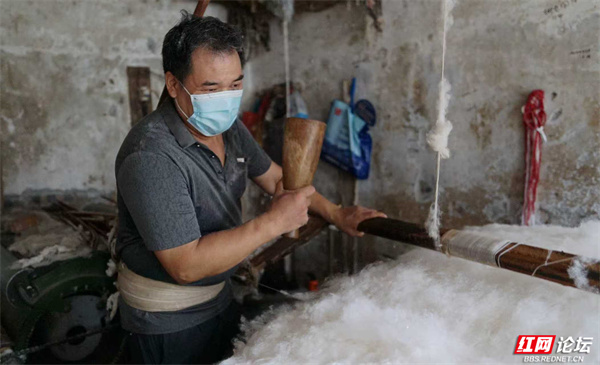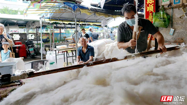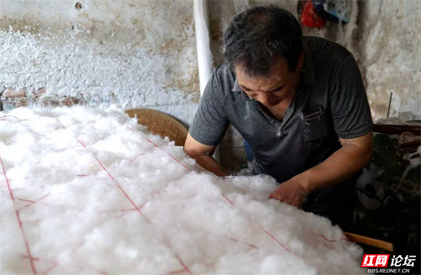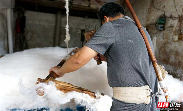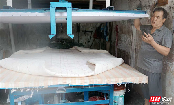 随着工业技术发展,手工弹棉花渐被机械化操作取代,这门古老手艺,在郴州或许只剩廖师傅这独一家。我好奇询问58岁的廖荣文:“郴州街头满是机械化加工旧棉被的,您这个价格相同,手工又费时费力,咋坚持呀?”廖师傅笑答:“这里头有门道!机械疏松,打棉花,容易打碎棉花纤维,我手工弹出的棉被,更柔软、疏松;咱得顺应时代,摒弃过时落后的,好技术得发扬光大。以前加工旧棉被,抓着旧棉絮往排排钉子上狠梳,把它梳烂;压被子的人踩着棉被上的大木盘,又慢又累。现在我也用弹棉花机先疏松、打烂旧棉絮,再手工弹。加工旧棉被要经松棉、铺棉、弹棉、压棉、放线、铺纱、磨压等十几道工序,新老技术结合,所以还有顾客光顾,生意就这么维持着。”