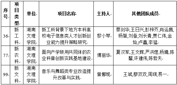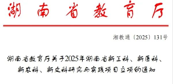 近日,湖南省教育厅发布《关于2025年湖南省新工科、新医科、新农科、新文科研究与实践项目立项的通知》,我校黎小琴、傅丽华、曾娜妮三位老师申报的项目分别成功获批新工科、新农科、新文科研究与实践项目,充分彰显了学校在高水平应用型人才培养和学科创新领域的实力与担当。