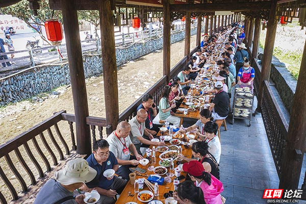 下午一点半,侗家儿女以传统拦门礼热情迎宾,为我们奉上清甜的杨梅汁。走进风雨长廊,合拢宴热闹开席,“高山流水”般的杨梅汁敬酒和欢快的转转杯接连不断,让我与同行游客深深沉浸在侗家人的好客与欢乐之中。