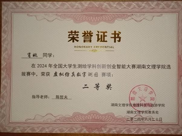 16. 2024年全国大学生测绘学科创新创业智能大赛湖南文理学院选拔赛“虚拟仿真数字测图”二等奖;