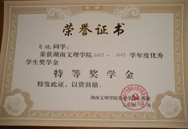 4. 湖南文理学院2022-2023学年度优秀学生奖学金“特等奖学金”;