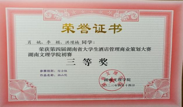 15. 第四届湖南省大学生酒店管理商业策划大赛湖南文理学院初赛“三等奖”;