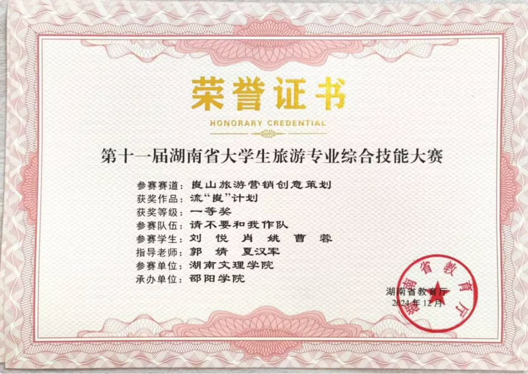 14. 2024年湖南省大学生旅游专业综合技能大赛(营销创意策划赛道)一等奖;