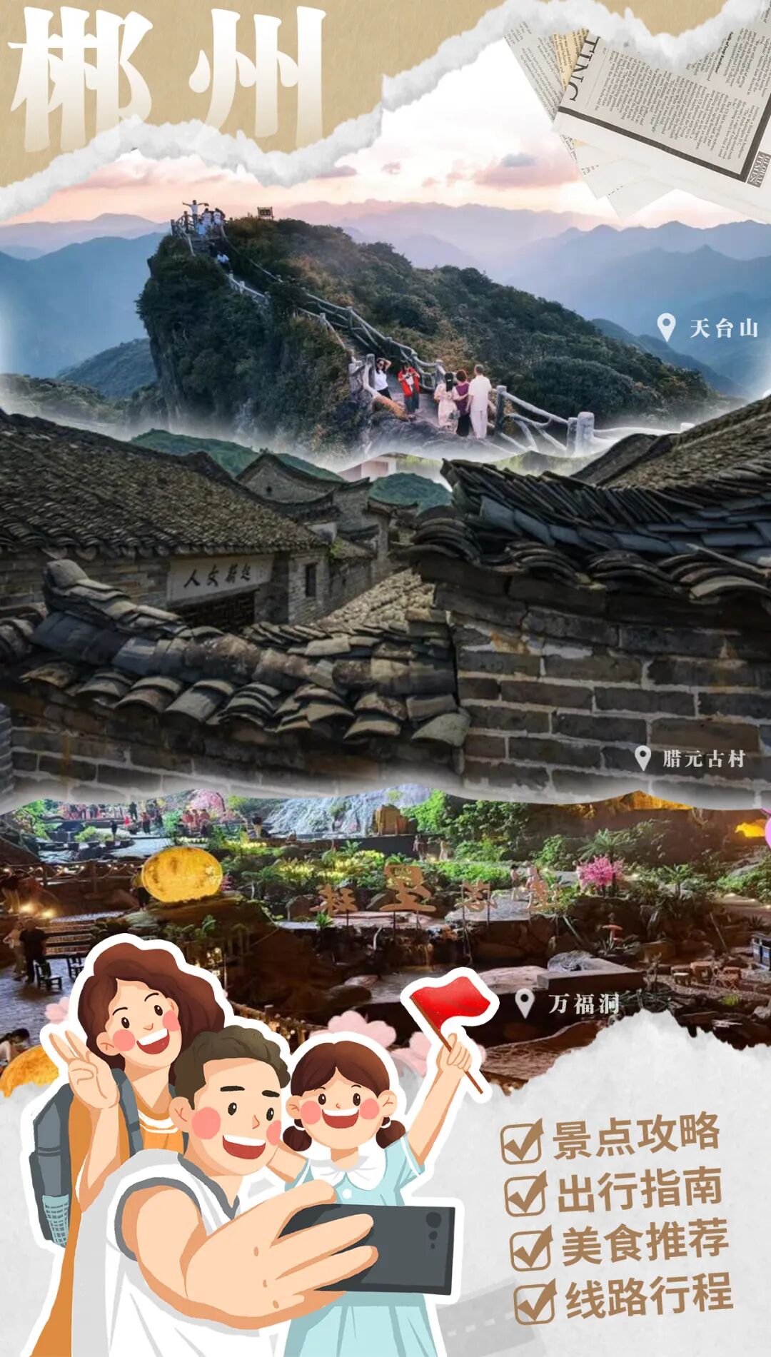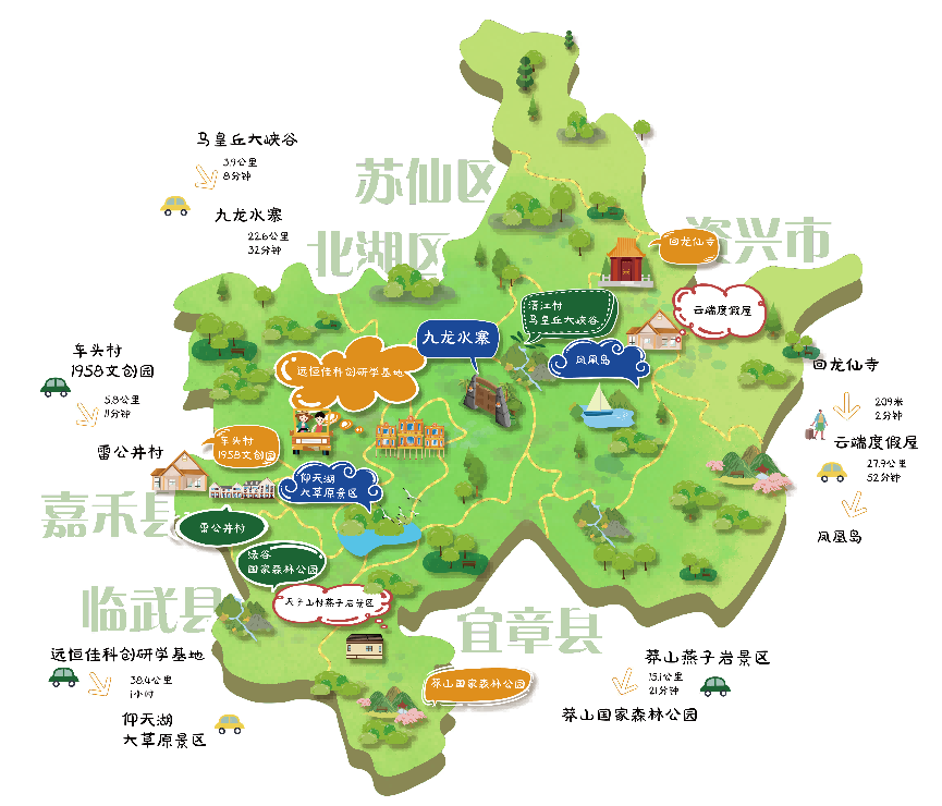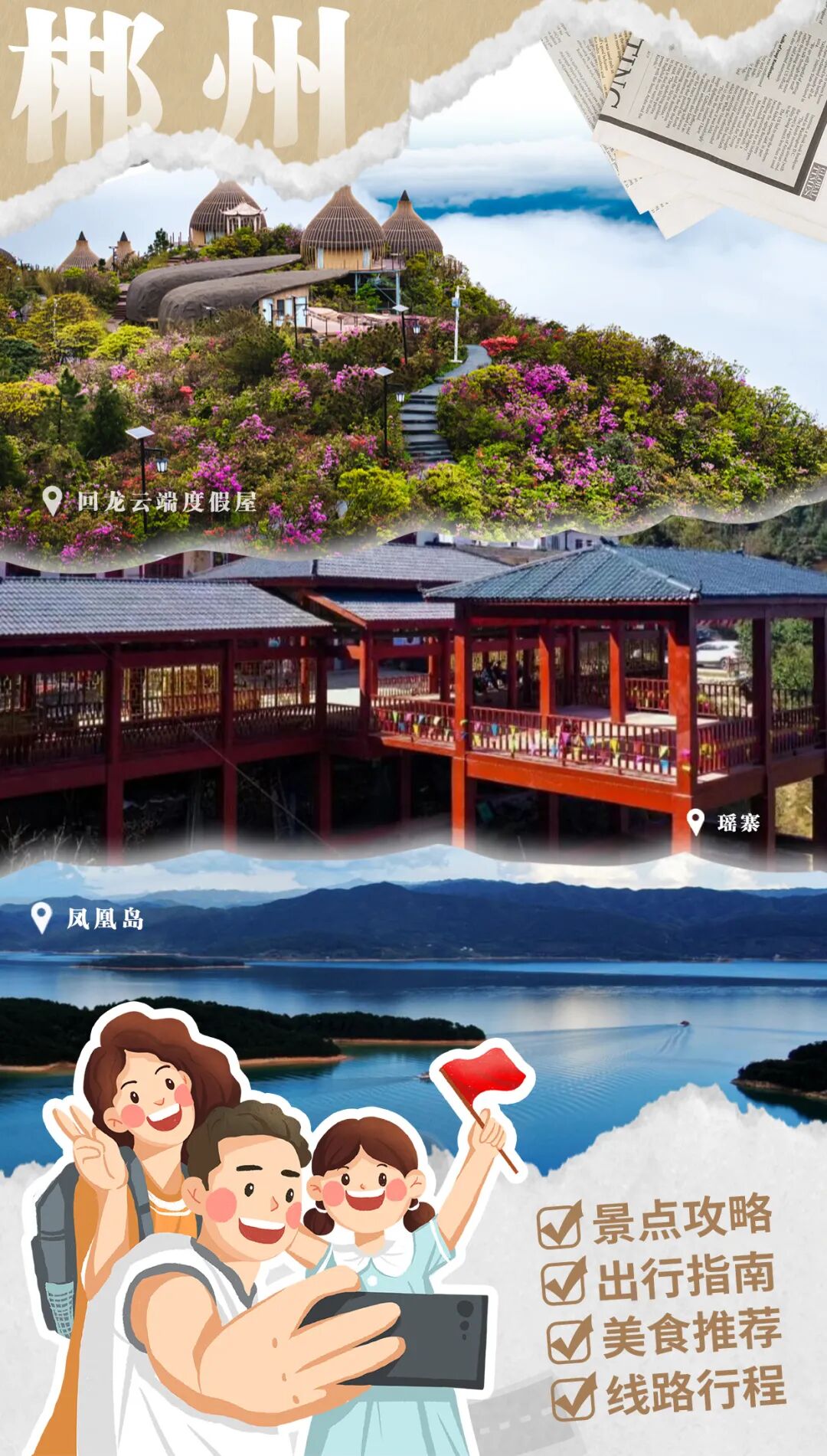 路线规划:资兴市回龙山(回龙望月)→二峰瑶寨→回龙仙寺→回龙云端度假屋→资兴市白廊镇→白廊环湖路→凤凰岛
