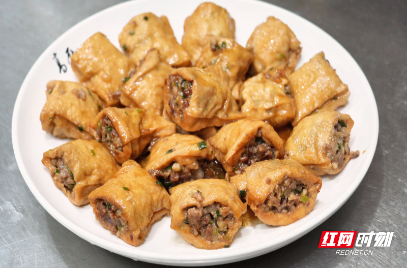 宜章酿豆腐:宜章酿豆腐选用本地黄心豆腐,切成六分厚的方块,用文火轻煎至金黄。外焦里嫩的豆腐,既能锁住馅料的鲜香,又能在汤汁的浸润中保持筋道。