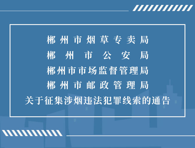 为贯彻落实《中华人民共和国烟草专卖法》,切实维护国家利益和消费者利益,严厉打击各类涉烟违法犯罪活动,营造规范有序的卷烟市场秩序,现面向社会征集涉烟违法犯罪线索。现通告如下: