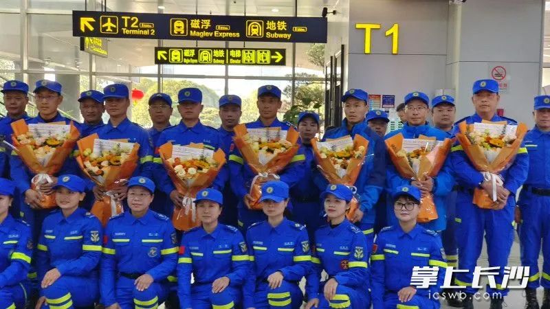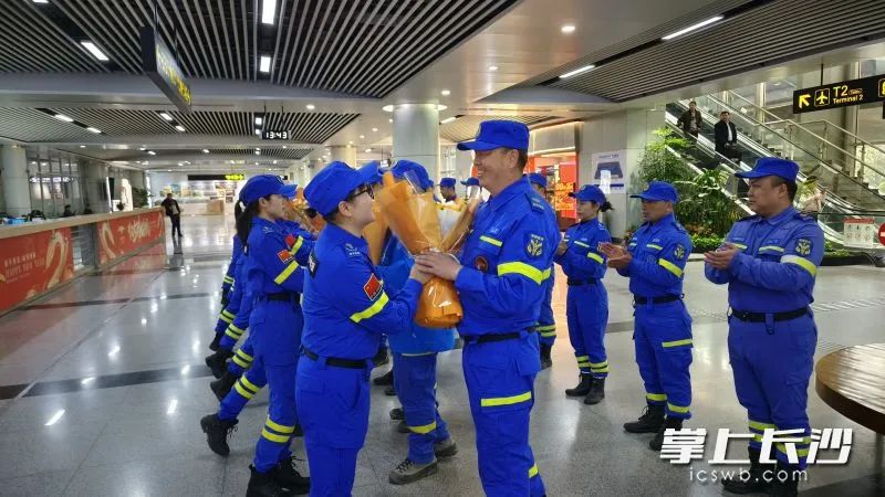 1月12日下午1时40分许,岳麓蓝天救援队10名队员在圆满完成救灾任务后,搭乘西藏航空TV9979次航班顺利到达长沙黄花国际机场,受到了岳麓蓝天救援队在长其他队员的热烈欢迎。大家为胜利归来的队友献上了鲜花和掌声。