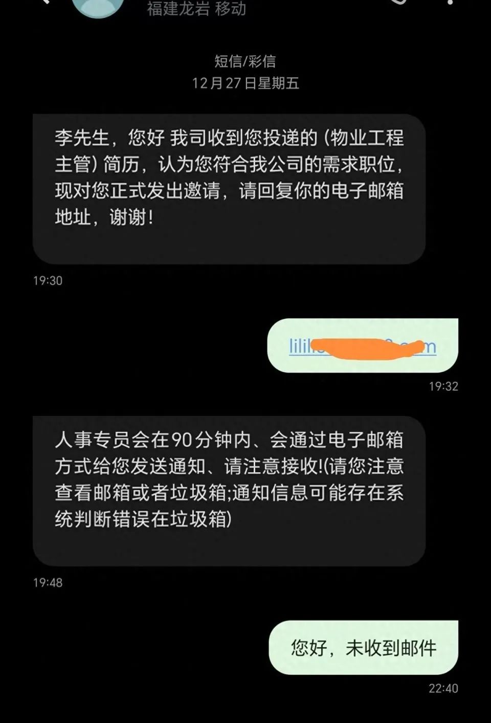 诱人诱饵:12 月 27 日,李先生收到短信,某公司称收到 “物业工程主管” 简历,邀他回邮,还保证 90 分钟内发通知。薪资可观,他迅速回应,随后收到优渥待遇的邮件,当即决定应聘。