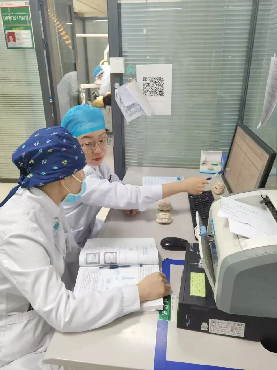 2024年4月,吐鲁番市人民医院口腔科门诊,湖南“小组团”医疗人才罗芬正指导当地医生制定诊疗方案。