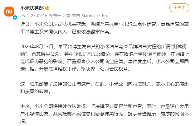 1月25日,小米法务部通过微博发布消息称,近日,小米公司从司法机关获悉,涉嫌恶意抹黑小米汽车商业信誉、商品声誉的某平台博主及其同伙多人,已被依法缉拿归案。