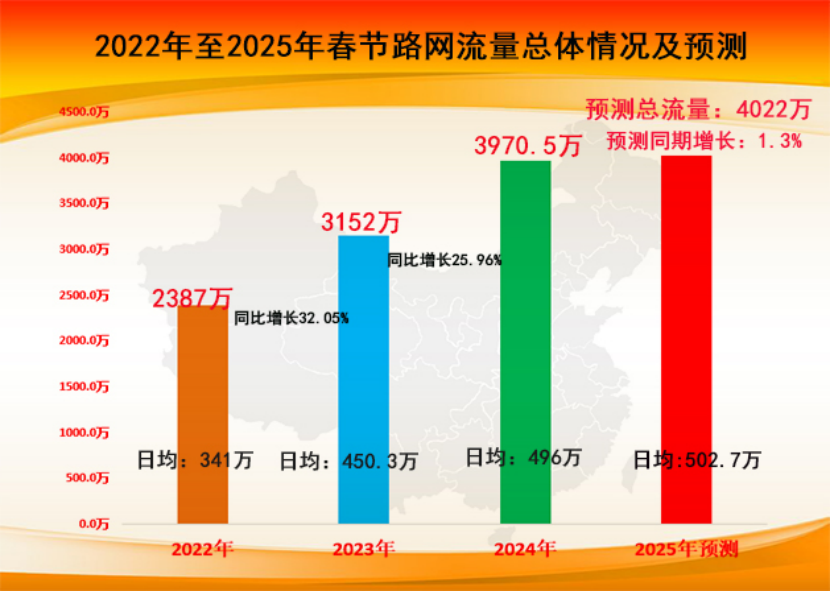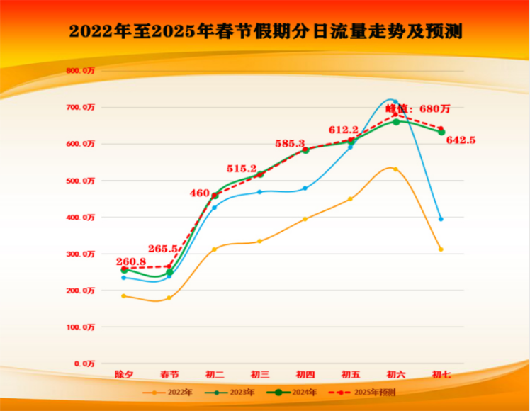 近四年春节假期高速公路出入口总流量及预测。注:2022年、2023年春节假期为除夕至正月初六,2024年春节假期为正月初一至初八,2025年春节假期为除夕至正月初七。