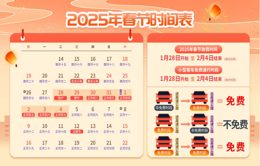 2025年春节假期共8天(1月28日至2月4日,除夕至正月初七),高速公路实行小型客车免费通行政策。根据气象部门预测,春节假期我省降水前少后多,气温略偏高,发生大范围雨雪冰冻天气可能性较小,但须警惕雾、霾天气以及降雨对交通出行的不利影响。