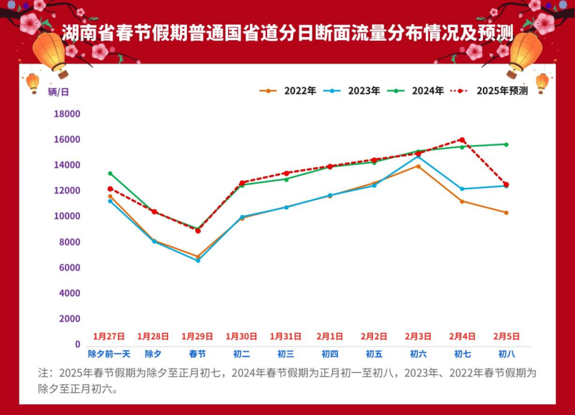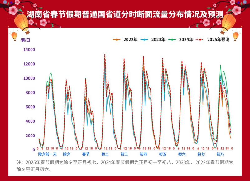 (3)预计普通国省道断面流量小幅增长。预计普通国省道日均断面流量约13,088辆,较2024年同期增长1.25%,约为平日的1.34倍。将在正月初七(2月4日)迎来峰值,峰值日流量为16,015辆,约为平日的1.64倍。高峰时段主要集中在初二至初五10时至12时,初四14时至16时,初五14时至17时;G353洞庭湖大桥西观测站、S221龙头山、G107云溪、S101沩水桥、G357华塘站等节点断面流量较大。