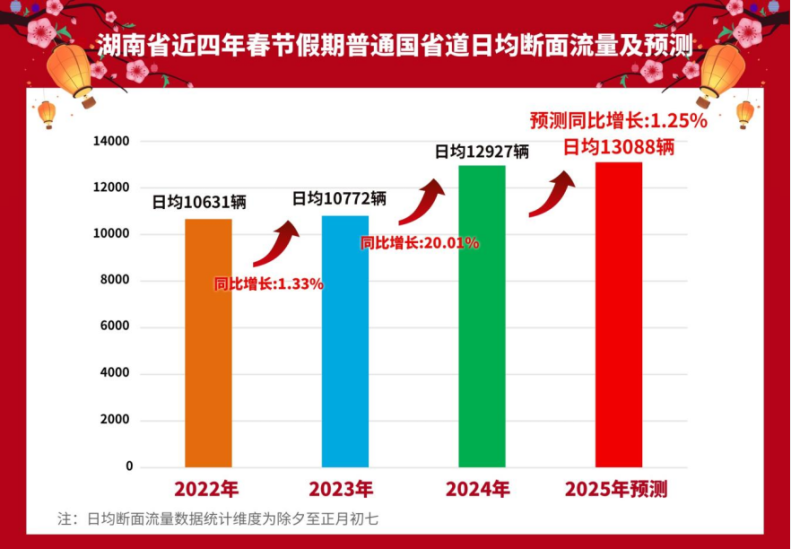 预计普通国省道日均断面流量约13,088辆,较2024年同期增长1.25%,约为平日的1.34倍。