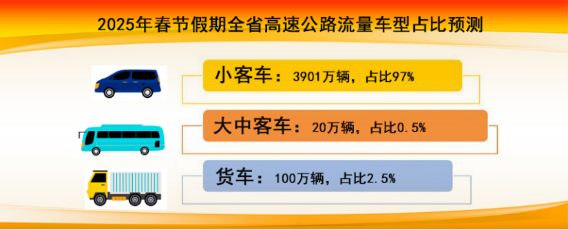预计1月28日(除夕)全省高速路网车流相对平稳,路网运行压力最小。