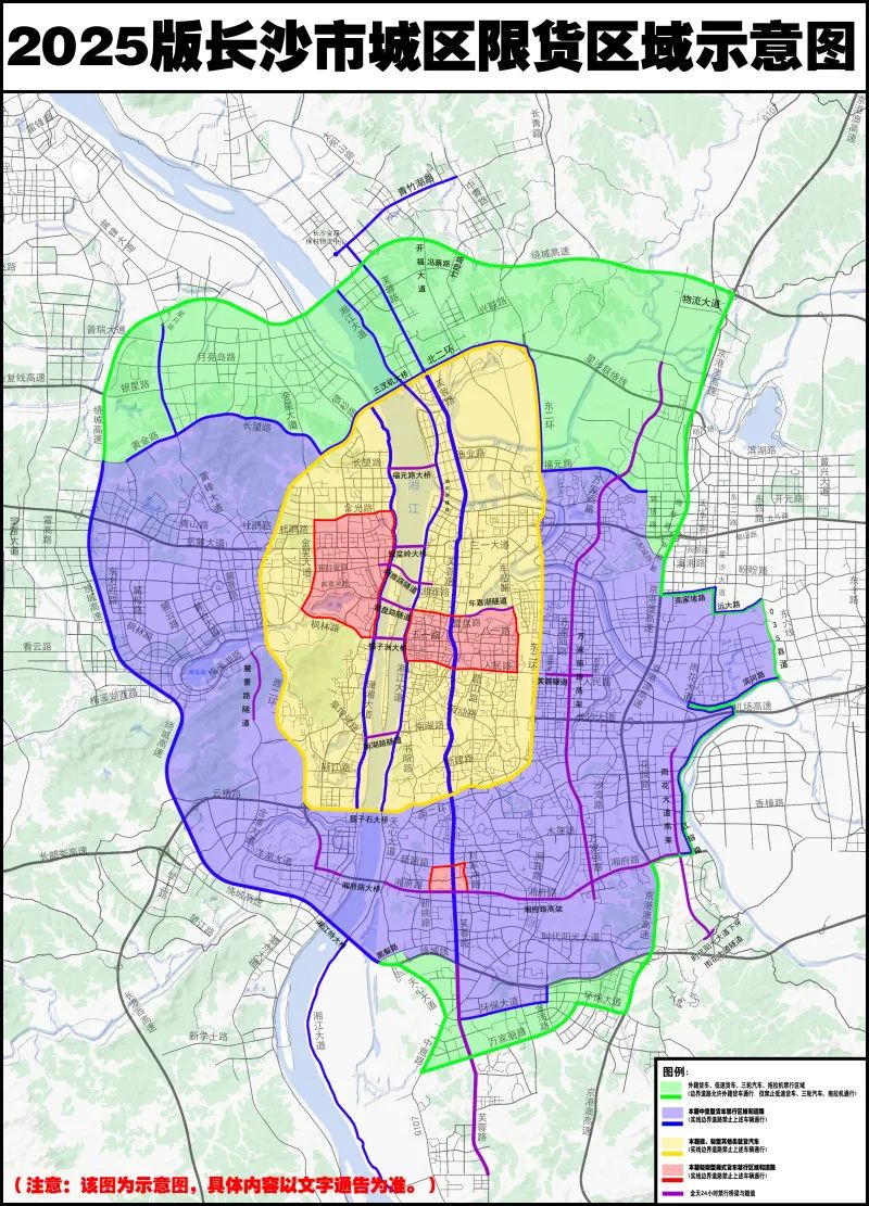 万家丽路高架桥、湘府路高架桥(含隧道)、雨花大道高架桥劳动路至时代阳光大道路段(含隧道)、芙蓉大道中意路至融城路主线道路(含桥隧),湘江橘子洲大桥、银盆岭大桥、福元路大桥,湘江营盘路隧道、南湖路隧道、湘雅路隧道,营盘路年嘉湖隧道、湘江路浏阳河隧道、麓景路隧道、时代阳光大道东延线下穿雨花大道隧道、人民路芙蓉隧道。我市对湘A号牌的微、轻型载货汽车在城区范围内实行提前报备、便利通行的管理措施。湘A号牌的微、轻型载货汽车(在检验有效期内,达到国四排放标准,且无交通违法未处理记录,无交通事故未处理记录)通过“长沙交警”微信公众号,每年须向车辆登记地所属辖区交警大队进行车辆报备后,具备本年度在长沙市城区范围内的便利通行资格。1.具备本年度便利通行资格的湘A号牌的微、轻型封闭式载货汽车除第一条规定的全天24小时禁止载货汽车通行的道路及路段外,其余道路均可通行。2.具备本年度便利通行资格的湘A号牌的微、轻型厢式载货汽车除第一条规定的全天24小时禁止载货汽车通行的道路及路段外,以下时段、区域、路段禁止通行:每日7:00至22:00,营盘路(湘江路至车站路路段)-车站路(营盘路至人民路路段)-人民路(车站路至湘江路路段)-湘江路(人民路至营盘路路段)围合区域(含边界路段)禁止通行。每日7:00至22:00,含光路(金星路至潇湘大道路段)-潇湘大道(含光路至枫林路路段)-枫林路(潇湘大道至金星路路段)-金星路(枫林路至含光路路段)围合区域(含边界路段)禁止通行。每日7:00至22:00,新韶路(新姚路至刘家冲路路段)-刘家冲路(新韶路至湘府路路段)-湘府路(刘家冲路至新姚路路段)-新姚路(湘府路至新韶路路段)围合区域(含边界路段)禁止通行。每日7:00至9:30、16:30至19:30,二环线围合区域(含边界道路)禁止通行。3.具备本年度便利通行资格的湘A号牌的微、轻型其他类载货汽车(除封闭式、厢式以外的其他类)除第一条规定的全天24小时禁止载货汽车通行的道路及路段外,以下时段、区域、路段禁止通行:每日7:00至22:00,二环线围合区域禁止通行(边界道路二环线及湘江猴子石大桥、三汊矶大桥7:00至9:30、16:30时至19:30禁止通行)。每日7:00至22:00,新韶路(新姚路至刘家冲路路段)-刘家冲路(新韶路至湘府路路段)-湘府路(刘家冲路至新姚路路段)、新姚路(湘府路至新韶路路段)围合区域(含边界路段)禁止通行。每日7:00至9:30、16:30至19:30,湘江湘府路大桥禁止通行。4.不具备本年度便利通行资格的湘A号牌的微、轻型载货汽车,受本通告湘A号牌的中、重型载货汽车禁止通行的时段、区域、路段限制。5.湘A号牌的整车长度不超过6米、宽度不超过2.2米、高度不超过2.8米的中型厢式载货汽车享有轻型厢式载货汽车同等通行权。除第一条规定的全天24小时禁止载货汽车通行的道路及路段外,以下时段、区域、路段禁止通行:1.全天24小时禁止在芙蓉路北二环至绕城高速南段路段、湘江路北二环至南二环路段、潇湘大道北二环至南二环路段通行。2.每日7:00至22:00,北二环(潇湘大道至长望路路段)、长望路-黄金路(北二环至绕城高速西北段)、绕城高速西北段-绕城高速西南段(黄金路至黑梨路路段)、黑梨路-雀园路(绕城高速西南段至枫山路路段)、枫山路(雀园路至绕城高速西南段路段)、绕城高速西南段(枫山路至芙蓉路路段)、芙蓉路(绕城高速西南段至环保大道路段)、环保大道(芙蓉路至金海路路段)、金海路(环保大道至绕城高速西南段)、绕城高速西南段(金海路至京港澳高速李家塘互通路段)、京港澳高速(李家塘互通至湘府路路段)、湘府路(京港澳高速至江榕路路段)、江榕路(湘府路至雨花大道路段)、雨花大道跨浏阳河路段、滨河路(雨花大道至035县道路段)、035县道(滨河路至远大路路段)、远大路(035县道至星沙大道路段)、星沙大道(远大路至高家坡路路段)、高家坡路(星沙大道至京港澳高速路段)、京港澳高速(高家坡路至汽配城路路段)、汽配城路-锦绣路(京港澳高速至福元路路段)、福元路(锦绣路至东二环路段)、东二环-北二环(福元路至潇湘大道路段)围合区域(除黄金路东方红路至绕城高速路段、黑梨路-雀园路、枫山路、汽配城路-锦绣路、京港澳高速、机场高速、绕城高速外,其他均含边界路段)禁止通行,围合区域内岳麓大道绕城高速至东方红路路段、东方红路黄金路至枫林路路段允许通行。3.每日7:00至22:00,湘江路绕城高速西北段至三汊矶大桥路段、湘江路绕城高速西南段至融城路路段、芙蓉路青竹湖大道至北二环路段、青竹湖路长沙金霞保税物流中心出入口至中青路路段、雷锋大道星月路至长望路路段禁止通行。除第一条规定的全天24小时禁止载货汽车通行的道路及路段外,以下时段、区域、路段禁止通行:1.全天24小时禁止在芙蓉路北二环至绕城高速西南段路段、湘江路北二环至南二环路段、潇湘大道北二环至南二环路段通行。2.每日7:00至22:00,绕城高速西北段-绕城高速西南段(京港澳高速至天心大道路段)、天心大道-中意路(绕城高速西南段至万家丽路路段)、万家丽路(中意路至环保大道路段)、环保大道(万家丽路至京港澳高速路段)、京港澳高速(环保大道至湘府路路段)、湘府路(京港澳高速至江榕路路段)、江榕路(湘府路至雨花大道路段)、雨花大道跨浏阳河路段、滨河路(雨花大道至035县道路段)、035县道(滨
