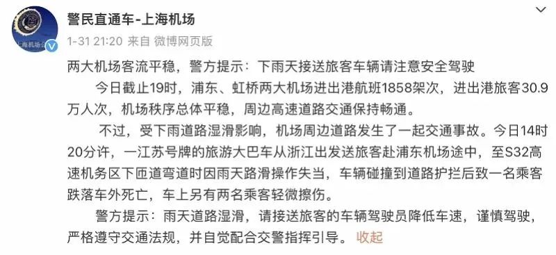 1月31日,一江苏号牌的旅游大巴车从浙江出发送旅客赴浦东机场途中,至S32高速机务区下匝道弯道时因雨天路滑操作失当,车辆碰撞到道路护栏后致一名乘客跌落车外死亡,车上另有两名乘客轻微擦伤。