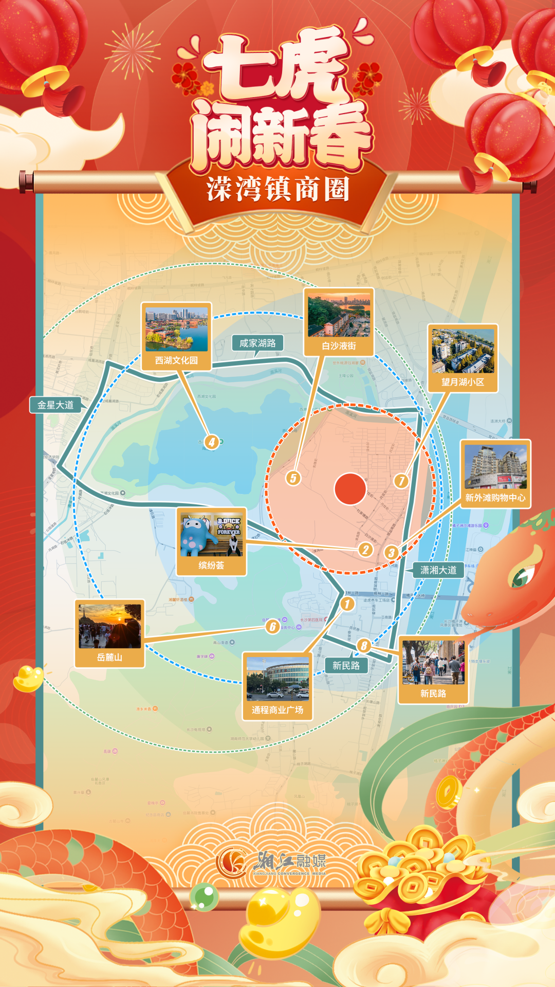 近年来,湖南湘江新区通过商圈设施升级、环境美化、品牌集聚及业态优化等措施,充分发挥商圈效应,促进消费模式创新,带动产业发展。目前,新区拥有桐梓坡、梅溪湖、洋湖-大王山等七大重点商圈。值此蛇年春节期间,湘江新区融媒体中心特别策划“七虎”闹新春栏目,为您精彩呈现这七大商圈的独特魅力。