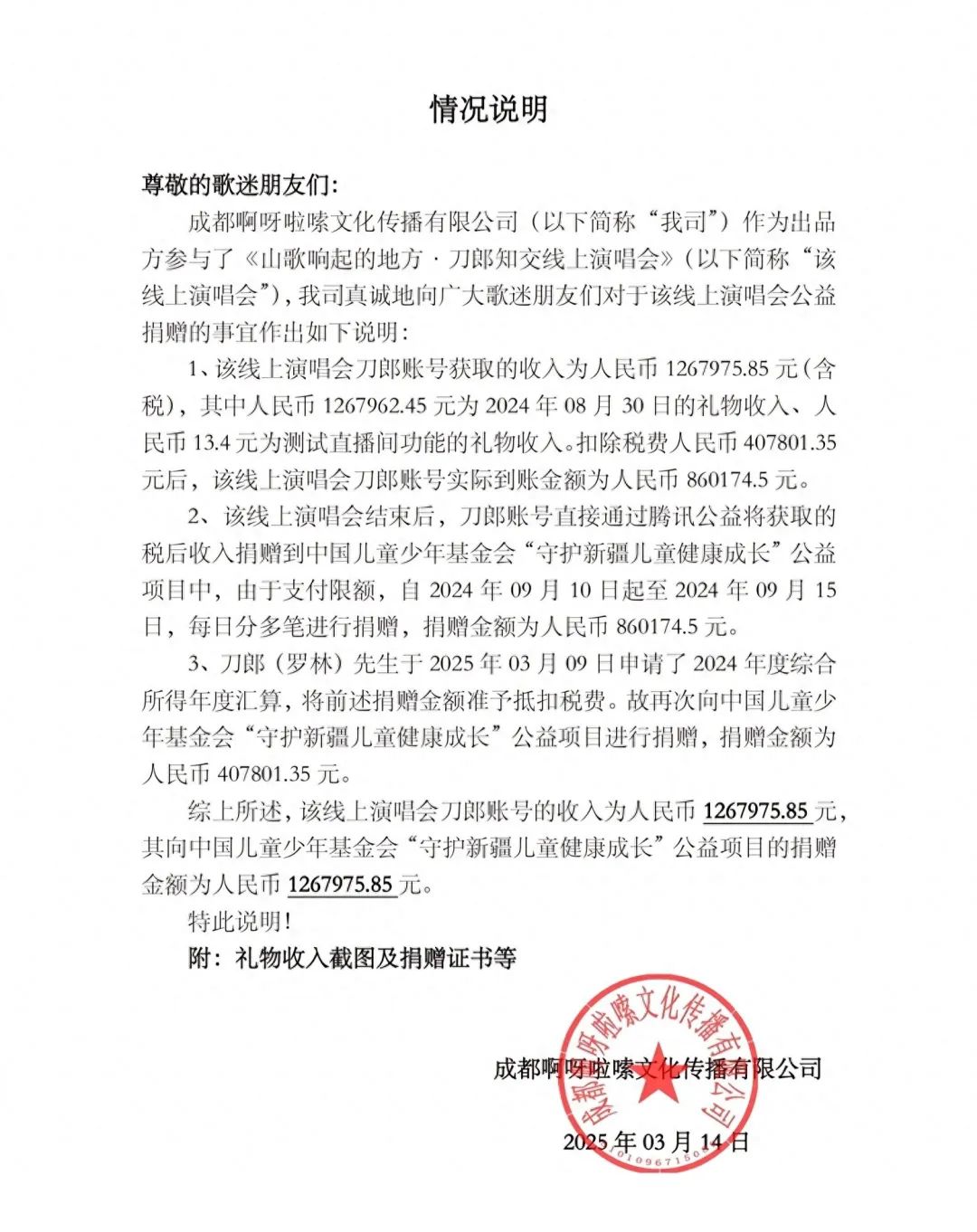 近日,成都啊呀啦嗦文化传播有限公司发布情况说明,向广大歌迷对于线上演唱会《山歌响起的地方·刀郎知交线上演唱会》公益捐赠的事宜作出说明。