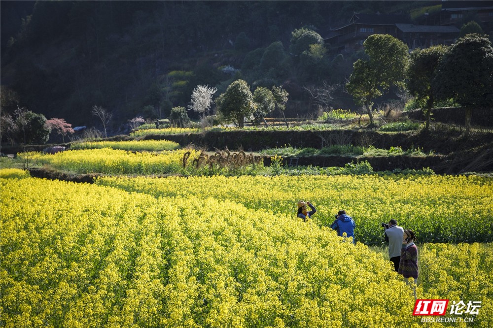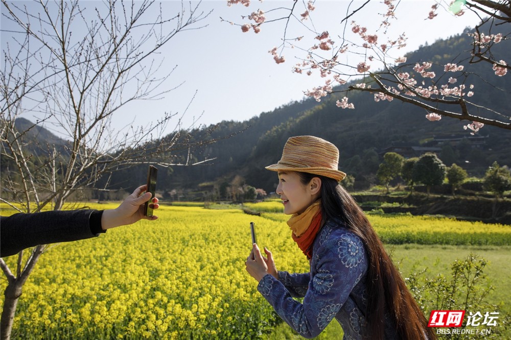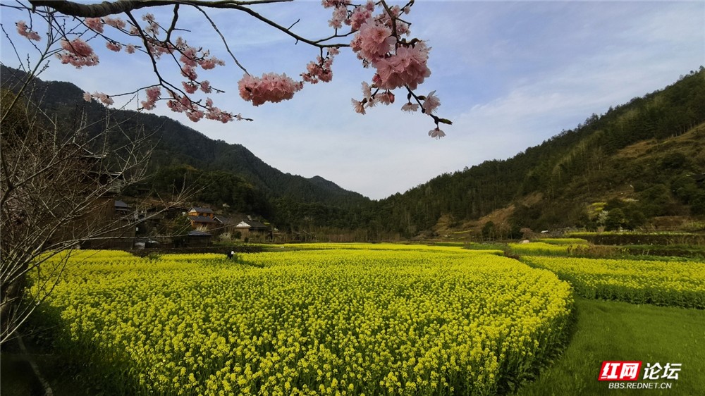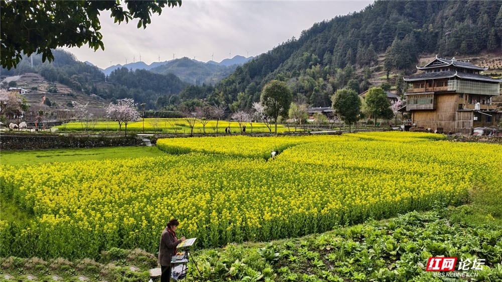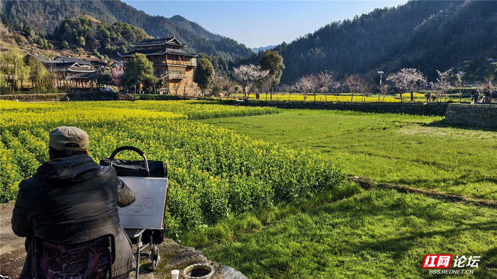 这里有丰富的色彩搭配。油菜花一片金黄,如同金色的海洋,热烈而灿烂。桃花如粉色的云霞,或深或浅,娇艳欲滴。两者相互映衬,再加上绿色的山峦、清澈的溪流,以及古朴的村落建筑,构成了一幅色彩斑斓且层次丰富的画面,为写生提供了丰富的素材。