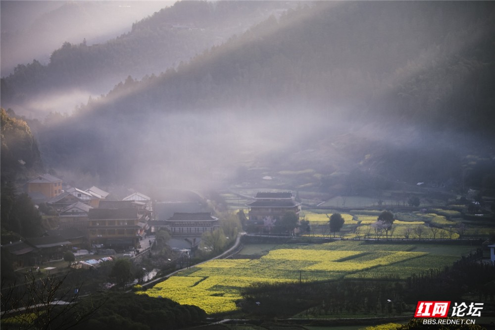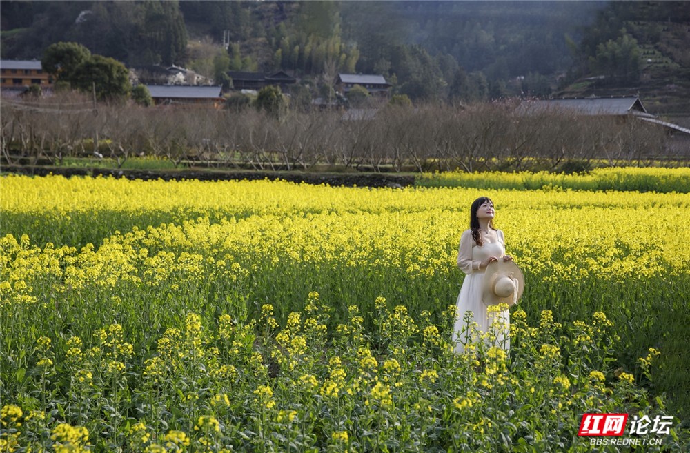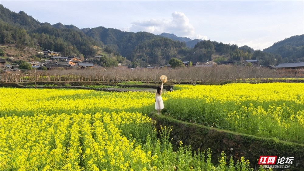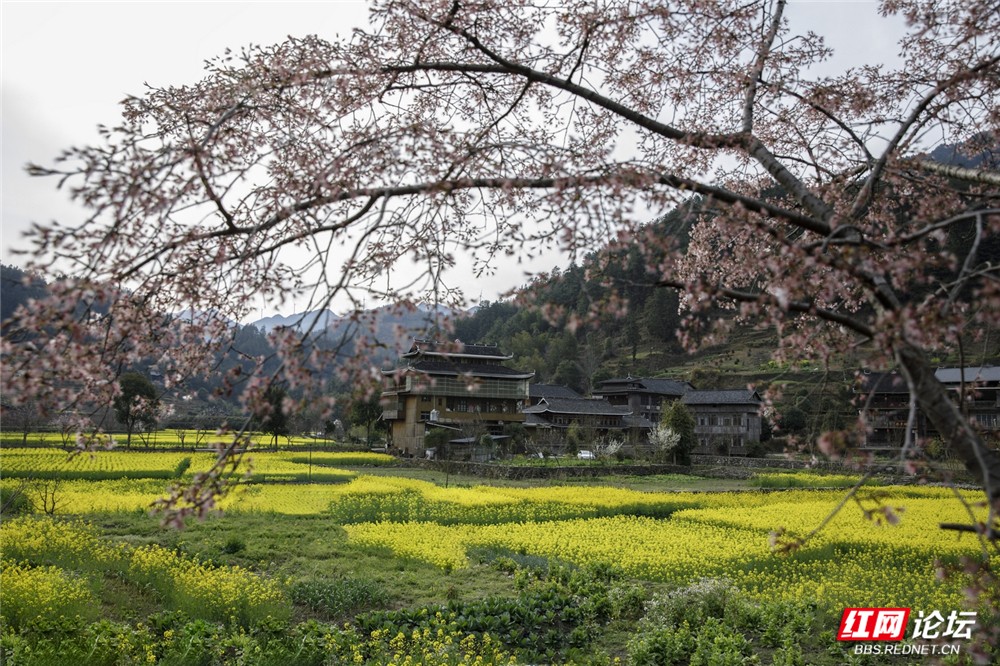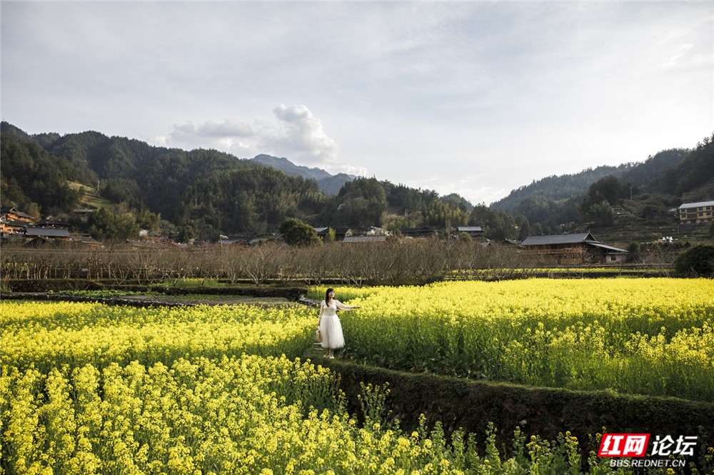 这里有丰富的色彩搭配。油菜花一片金黄,如同金色的海洋,热烈而灿烂。桃花如粉色的云霞,或深或浅,娇艳欲滴。两者相互映衬,再加上绿色的山峦、清澈的溪流,以及古朴的村落建筑,构成了一幅色彩斑斓且层次丰富的画面,为写生提供了丰富的素材。