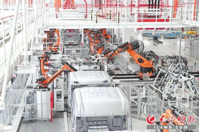 三一智联重卡产业园里,焊接机器人正在对重卡驾驶室进行焊接。长沙晚报全媒体记者 王志伟 摄