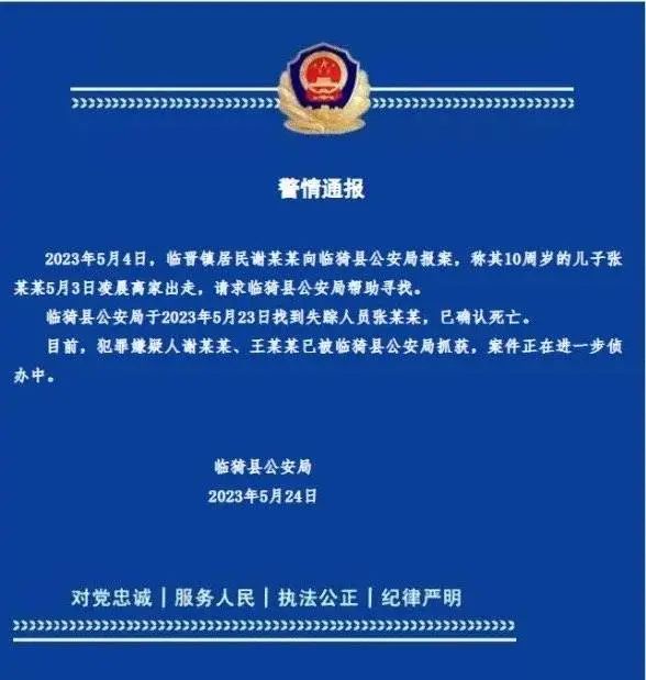 2023年5月24日早上,距离男孩失踪20多天后,临猗县公安局发布相关警情通报——临猗县公安局于2023年5月23日找到失踪人员张某侨,已确认死亡。犯罪嫌疑人谢某某、王某某已被临猗县公安局抓获,案件正在进一步侦办中。而嫌疑人谢某某、王某某分别是张某侨的生母、继父。
