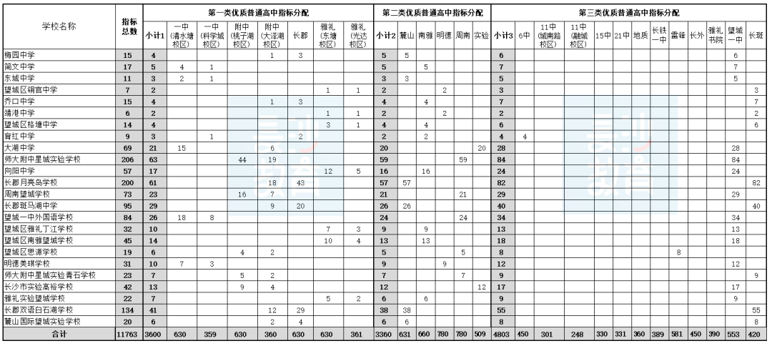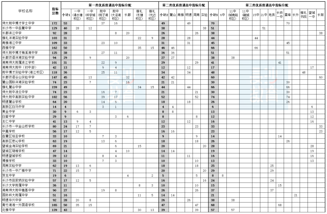 今天,长沙市教育局公布2025年长沙市城区优质普通高中指标生计划分配方案。今年每所初中学校原则上分配三类优质普通高中学校指标生计划。第一类优质普通高中学校为长沙市一中(含清水塘校区、科学城校区)、湖南师大附中(含桃子湖校区、大泽湖校区)、长郡中学、雅礼中学(含东塘校区、光达校区);第二类优质普通高中学校为明德中学、周南中学、长沙市实验中学、麓山国际实验学校、南雅中学;根据指标生有关政策要求,每位考生限填一所对应指标生学校志愿(同一所学校不同校区也只能选择其中一个校区填报)。今年各校指标生有多少?都分别在哪些学校?一起来看看指标生分配表吧!