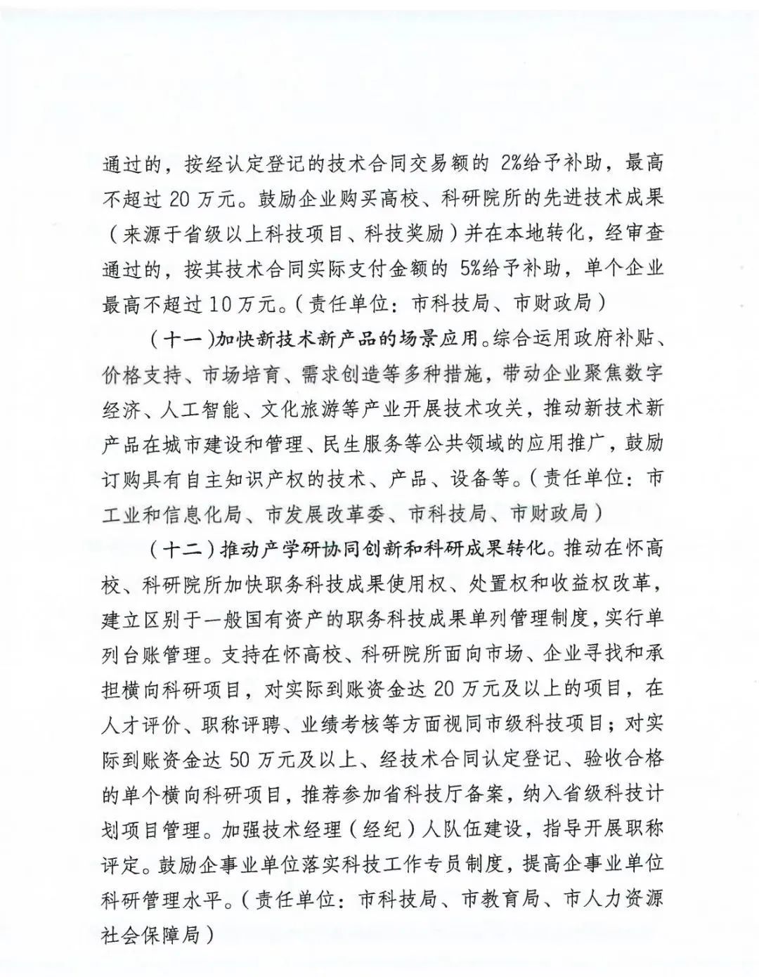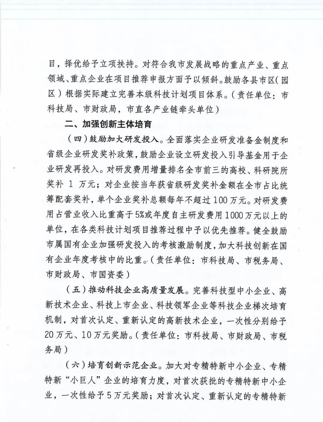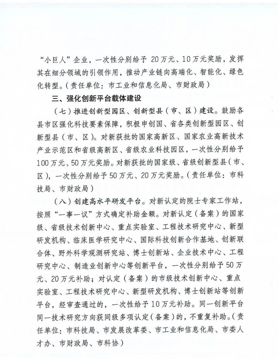 此外,《若干措施》还强调将推进创新型园区、创新型县(市、区)建设,创建高水平研发平台,建设全链条创新载体,搭建科技成果转化平台,推动产学研协同创新和科研成果转化,加强国际与区域科技合作,加速融入全省科技战略布局,集聚创新创业人才,加强科技金融服务,加强知识产权转化运用等。对新获批的国家高新区、国家农业高新技术产业示范区和省级高新区、省级农业科技园区,一次性分别给予100万元、50万元奖励。