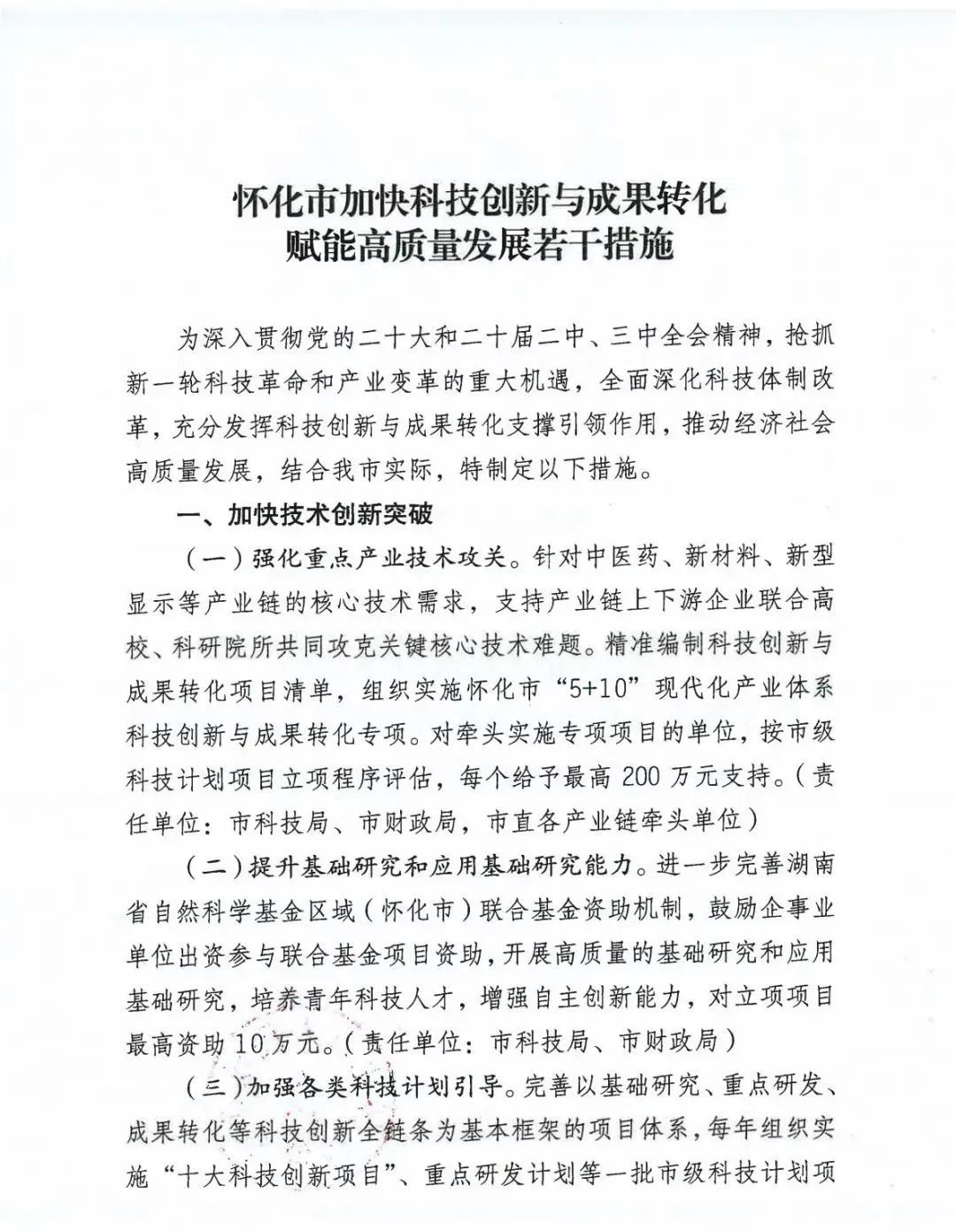 《若干措施》明确提出,将支持中医药、新材料、新型显示等产业链的核心技术攻关,鼓励企业联合高校、科研院所共同开展关键核心技术研发,并给予最高200万元的项目支持。值得一提的是,怀化还将完善科技型中小企业、高新技术企业等科技企业梯次培育机制,并加大对专精特新中小企业、专精特新“小巨人”企业的培育力度。对首次认定、重新认定的高新技术企业,一次性分别给予20万元、10万元奖励。