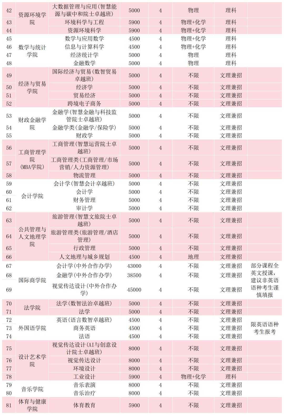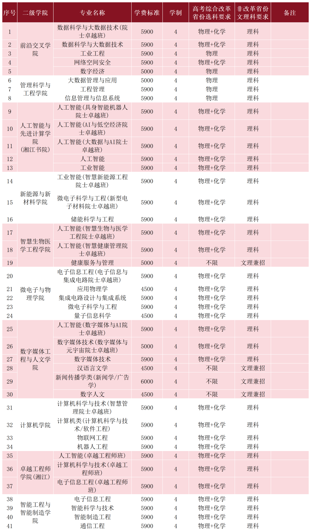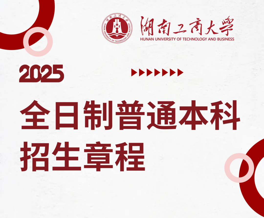 至诚至信 为实为新 01 总 则 第一条 根据《中华人民共和国教育法》《中华人民共和国高等教育法》等法律法规及教育部有关规定,结合学校招生工作实际,特制定本章程。 第二条 学校全称:湖南工商大学 办学地点:湖南省长沙市岳麓区岳麓大道569号(南校区)、湖南省长沙市望城区雷锋大道(北校区)、湖南省长沙市望城区大泽湖街道海归小镇(海归小镇校区)。 主管部门:湖南省教育厅 办学层次:本科 院校标识码:4143010554 办学类型:公办高校 第三条 颁发学历证书的学校名称:湖南工商大学。证书种类:全日制普通高等教育本科毕业证书、普通高等教育本科毕业生学士学位证书。 第四条 学校招生工作遵循“公平竞争、公正选拔、公开透明”的原则,坚决执行招生政策规定和纪律要求,严格实施考试招生“阳光工程”。 第五条 学校简介:学校位于全国历史文化名城湖南省省会长沙市,是一所院士领衔的涵盖管理学、经济学、工学、理学、法学、医学、文学、教育学、艺术学、交叉学科等多学科相互支撑、协调发展、特色鲜明的综合性大学,具有博士、硕士、学士学位授予权的省属全日制普通高等学校。 第六条 学校招生类别:普通类、艺术类、体育类、南疆单列计划、面向新疆吐鲁番地区援疆扶贫计划、对口招收中职毕业生计划、国家专项计划、地方专项计划、高水平运动队、中外合作办学本科项目等。 02 组织管理 第七条 学校成立本科招生领导小组,负责研究决定本校招生规模、政策制定等重大事项;成立本科招生工作小组,执行学校有关招生工作的决议;学校本科生院负责招生组织实施日常工作。 第八条 招生录取期间,学校纪委、监察专员办公室对招生录取工作进行全程监督检查,确保规范有序、公平公正。 第九条 学校招生工作严格执行教育部和湖南省教育厅政策规定和纪律要求,学校没有与任何社会机构及人员进行合作,没有委托社会机构招生。凡是有社会机构和个人宣传与我校有合作、可以通过“内部指标”方式确保考生录取的,考生可第一时间向教育主管部门反映,遭受相关损失的可向公安机关反映。 第十条 学校将严格执行招生政策和招生纪律,对于招生违规的考生及工作人员,按《国家教育考试违规处理办法》(教育部令33号)和《普通高等学校招生违规行为处理暂行办法》(教育部令36号)所确定的程序和规定进行处理。欢迎考生、家长及社会对学校招生工作进行监督。 03 招生计划 第十一条 学校2025年面向31省(区、市)招生,契合国家和地方政策导向,根据社会和经济发展需求,结合自身办学条件,统筹考虑毕业生就业情况和各省(区、市)的生源数量、生源质量、教育公平等因素,制定分省(区、市)分专业分科类招生计划。学校按照教育部和湖南省教育厅有关规定安排预留计划。预留计划数不超过当年招生计划总数的1%。预留计划使用时,坚持质量优先、公开透明的投放原则。 04 招生专业(类)及录取要求 第十二条 学校2025年招生专业(类) 点击查看大图 备注:我校2025年分省分专业(类)分科类招生计划及高考综合改革省份选科要求,以各省(区、市)招生考试机构公布的为准。根据属地管理原则,学校严格按照湖南省发改委、湖南省财政厅和湖南省教育厅核定的标准收费。如有变化,以湖南省发改委最新核定为准。 05 录取规则 第十三条 学校根据各省(区、市)生源情况确定调阅考生档案的比例。根据教育部规定,按照顺序志愿投档的批次,调档比例控制在110%以内。按照平行志愿投档的批次,调档比例控制在105%以内。 第十四条 学校不设定专业志愿分数级差,按“分数优先、遵循志愿”的原则确定考生专业。投档成绩相同条件下,根据生源所在省(区、市)同分排序规则安排专业。对于所有专业志愿都无法满足的考生,若服从专业调剂,则尽量调剂到同学科相近专业;若不服从专业调剂,则作退档处理。录取结束后不再退档。 第十五条 认可生源省(区、市)的高考加分政策,对于享受加分政策的考生(不含高水平运动队),加分计入专业分档成绩。 第十六条 英语(语言数智卓越班)、商务英语、法语各专业限招英语语种考生。其他专业(类)不限考生应试外语语种,但学校仅以英语作为基础外语安排教学。 第十七条 艺术类专业录取规则:报考我校艺术类(美术类、音乐类)专业(含中外合作办学)的考生,相应专业统考成绩和高考文化成绩必须达到生源地该批次艺术类专业录取控制分数线。具体录取规则依据生源地招生考试机构有关规定和《湖南工商大学2025年艺术类专业招生简章》执行。 第十八条 体育类专业录取规则:报考我校体育类(体育教育)专业的考生,专业统考成绩和高考文化成绩必须达到生源地该批次体育类专业录取控制分数线。进档考生按体育类投档成绩从高到低择优录取。 第十九条 高水平运动队录取规则:报考我校高水平运动队(网球项目)的考生,需参加由国家体育总局统一组织的专业测试及全国统一高考,具体录取规则依据教育部、生源地招生考试机构有关规定和《湖南工商大学2025年高水平运动队招生简章》执行。 06 附 则 第二十条 学校开设有“鸿班”、音乐舞蹈与人工智能卓越班等创新班,面向在校生遴选,选拔方式和条件由学校相关工作通知明确;学校转专业按《湖南工商大学本科学生转专业管理办法》执行。 第二十一条 学校除
