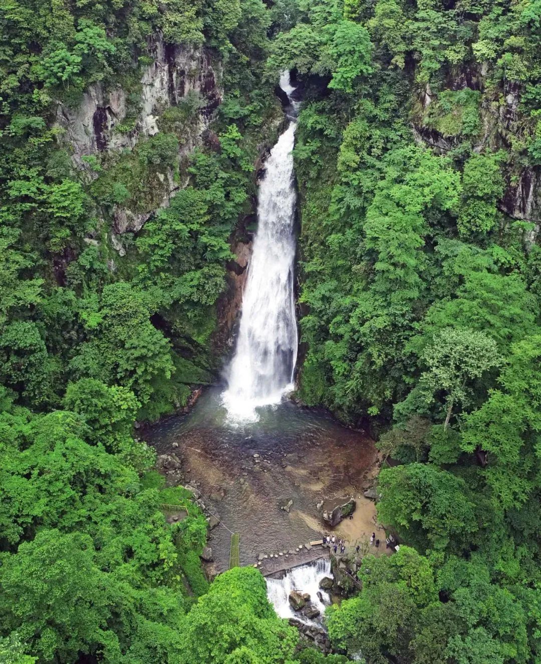 炎陵神农谷国家森林公园,游客在瀑布下避暑游玩