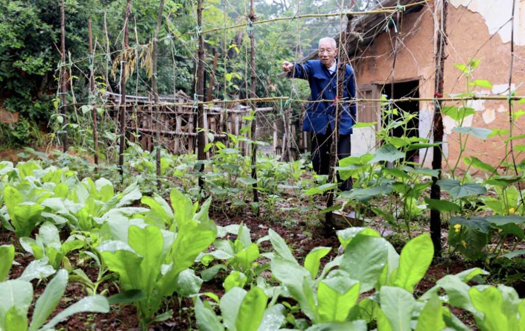 “后来我就开辟了一块菜园,一家人想吃什么就种什么。”在老屋的西院,这片小菜园至今还保留着,邓多贤仍坚持每天去走一走,看看亲手栽种的蔬菜。“这个做了架子的是丝瓜、黄瓜,那边是我种的茄子,还没结出来……自己种点菜,心里踏实。”有邻居说早睡早起、吃得健康是他们长寿的秘诀,邓多贤老人却笑着说:“自己种菜自己吃,这没啥特别的,关键还是要知足常乐。”