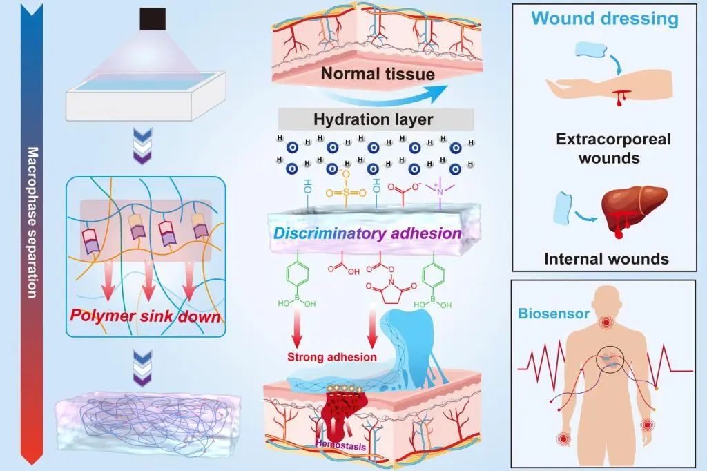 传统缝合技术可能导致二次损伤和疤痕形成,而现有的生物粘合剂往往无法区分健康组织与受损组织,容易引发不必要的粘连。针对这一挑战,该研究团队创新性地提出“静电相互作用触发宏观相分离聚合”策略,成功开发了一种双面异性水凝胶QAD敷料。该材料突破性地实现了对单侧强粘附与另一侧弱粘附的精准调控,可有效避免术后组织粘连问题。此外,QAD水凝胶展现出高效的止血、抗菌以及导电特性,为智能伤口敷料和生物传感器的开发提供了全新思路。
