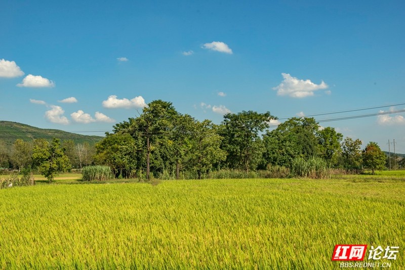 千亩稻田绕群山,丰收场景入镜来。(图源:红网论坛@花滩河边)