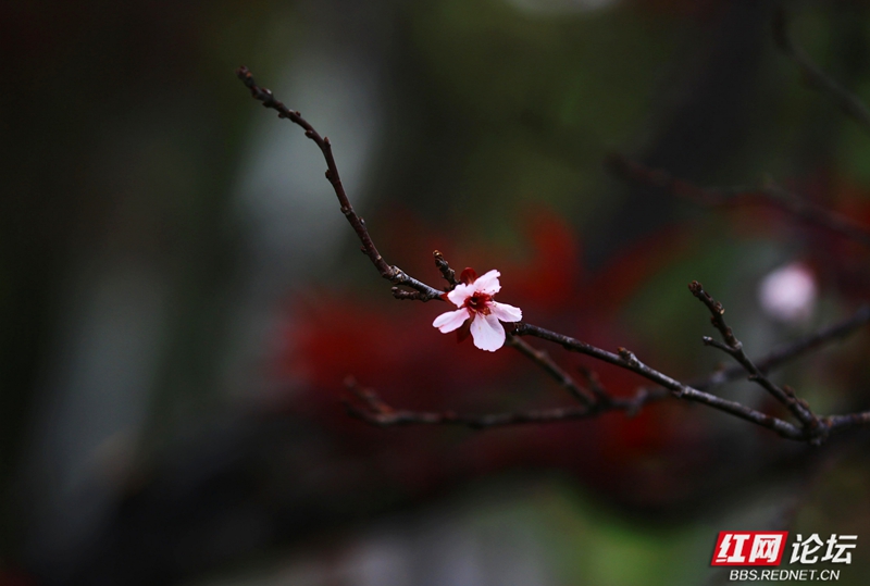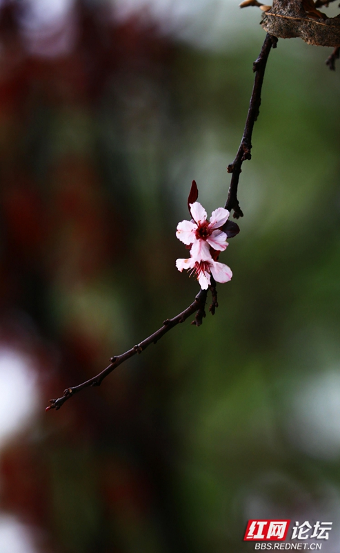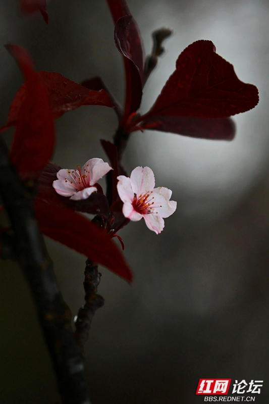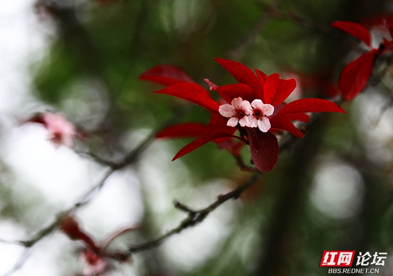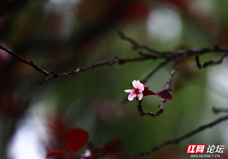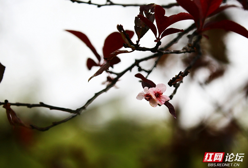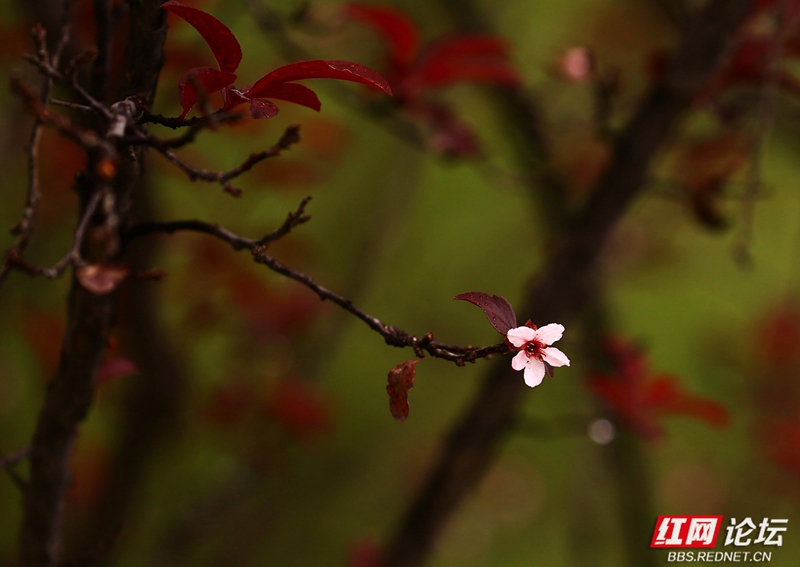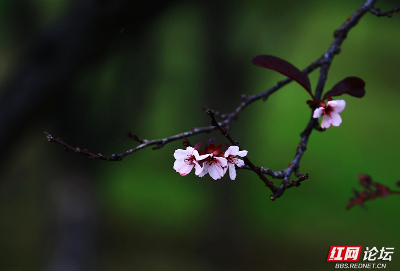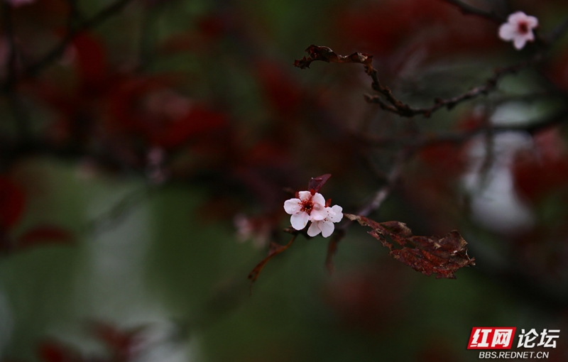 秋枝上的紫叶李,花开二度。(图源:红网论坛@益阳洪源)