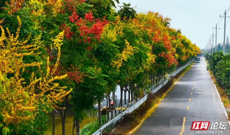 安乡县的金秋,宛如一幅浓墨重彩的画卷徐徐展开。公路两旁,树木披上红黄相间的彩衣,如飘逸的彩带蜿蜒延伸,点亮了整个季节的诗意。